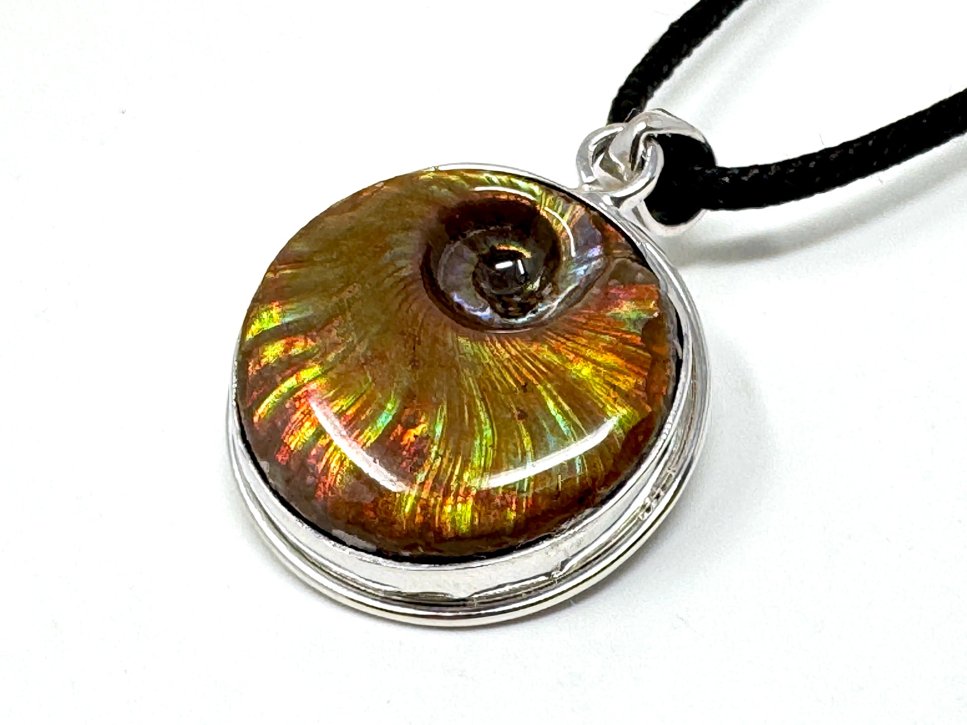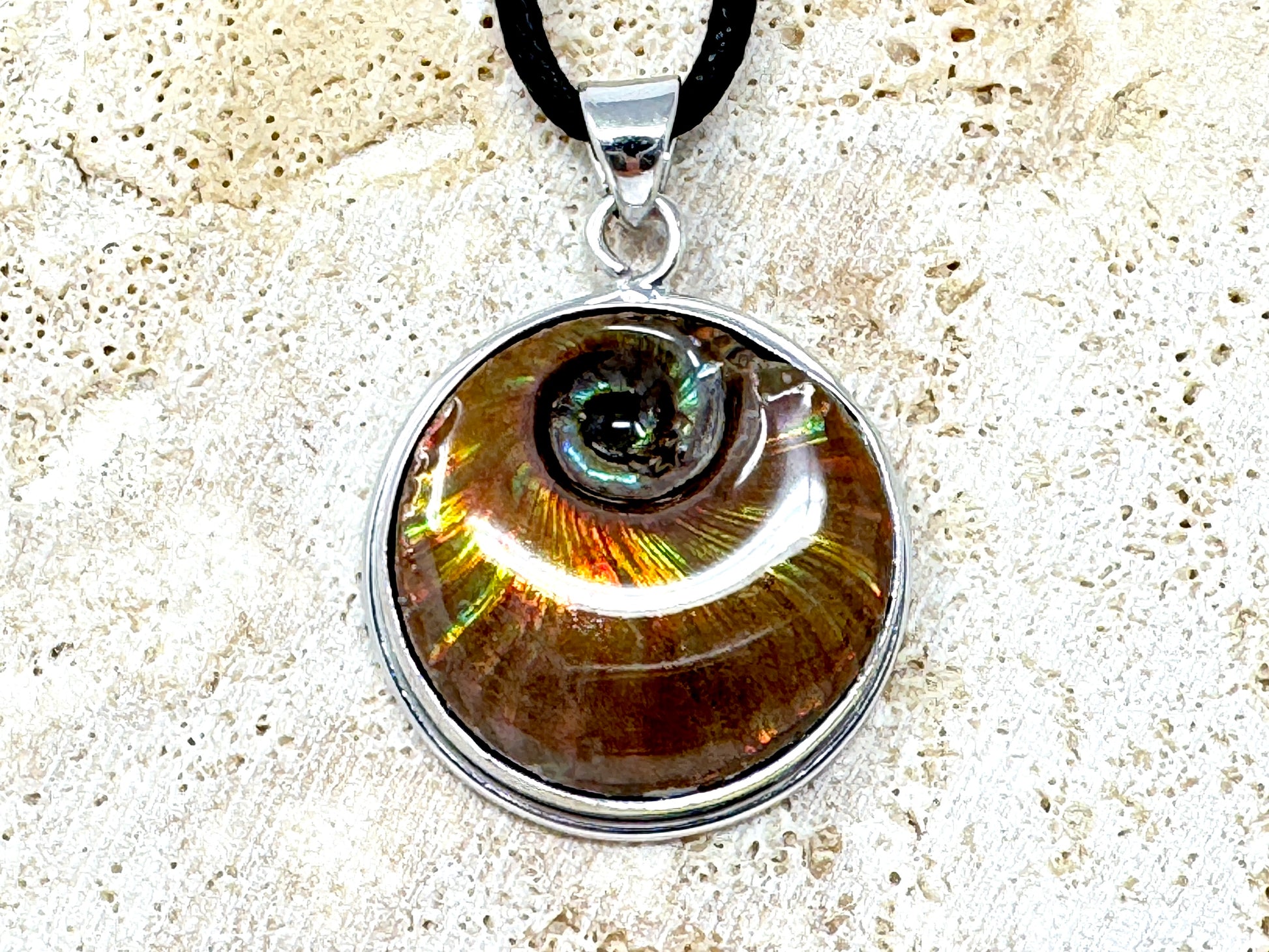 Iridescent Ammonite Round Pendant from Madagascar. This gorgeous 2.5cm long iridescent Ammonite Round Pendant is of the species Cleoniceras and comes from the jungles of Mahajanga on the north east coast of Madagascar. The ammonite fossil is of very high grade and has been prepared in our workshop in the UK to be set in 925 silver which is then Rhodium plated to give it a bright look and to prevent tarnishing. Beautiful dazzling colours dance over the ammonite showing off its iridescence in the light. The ammonite is 120 million years old from the cretaceous period.