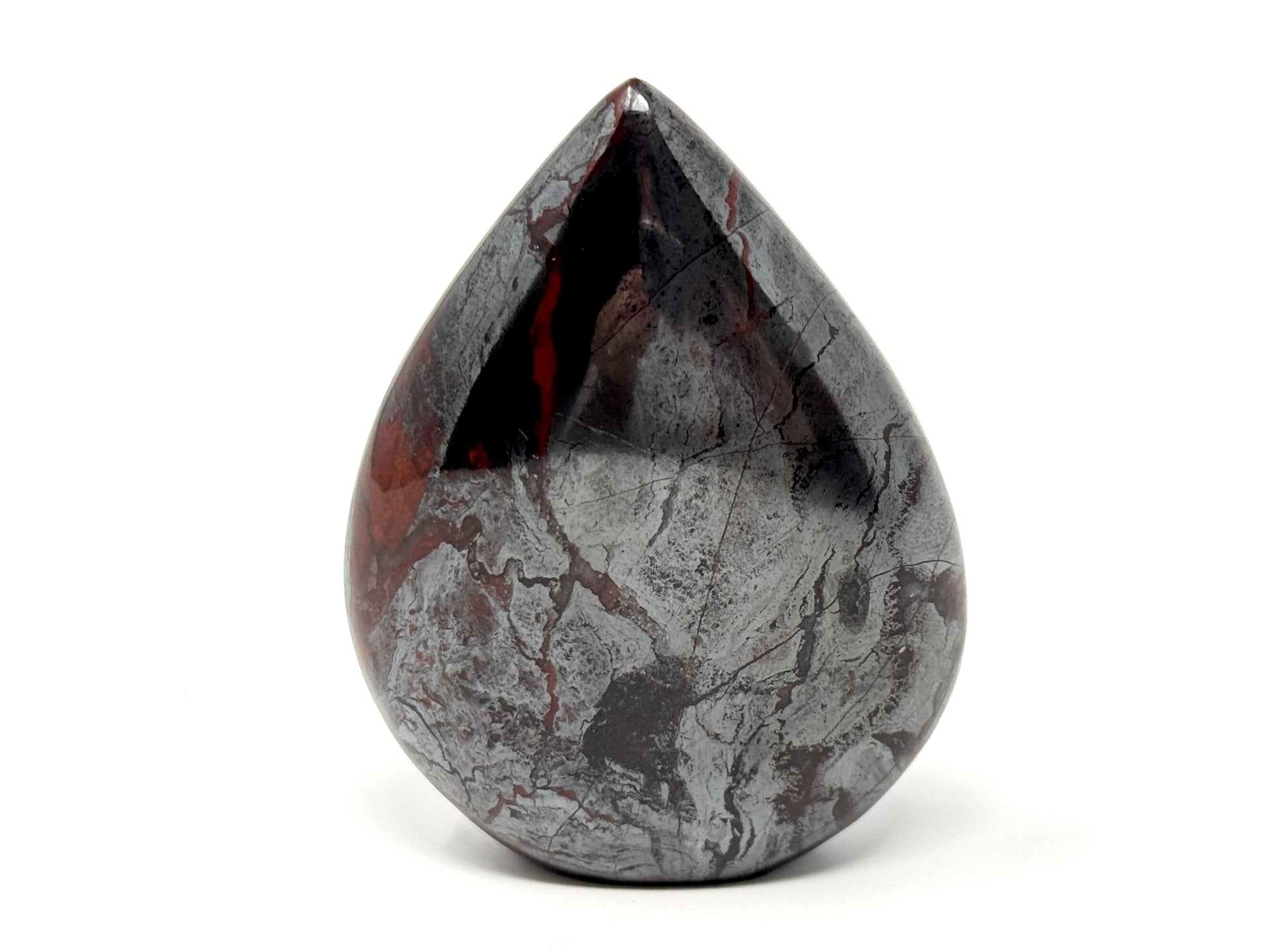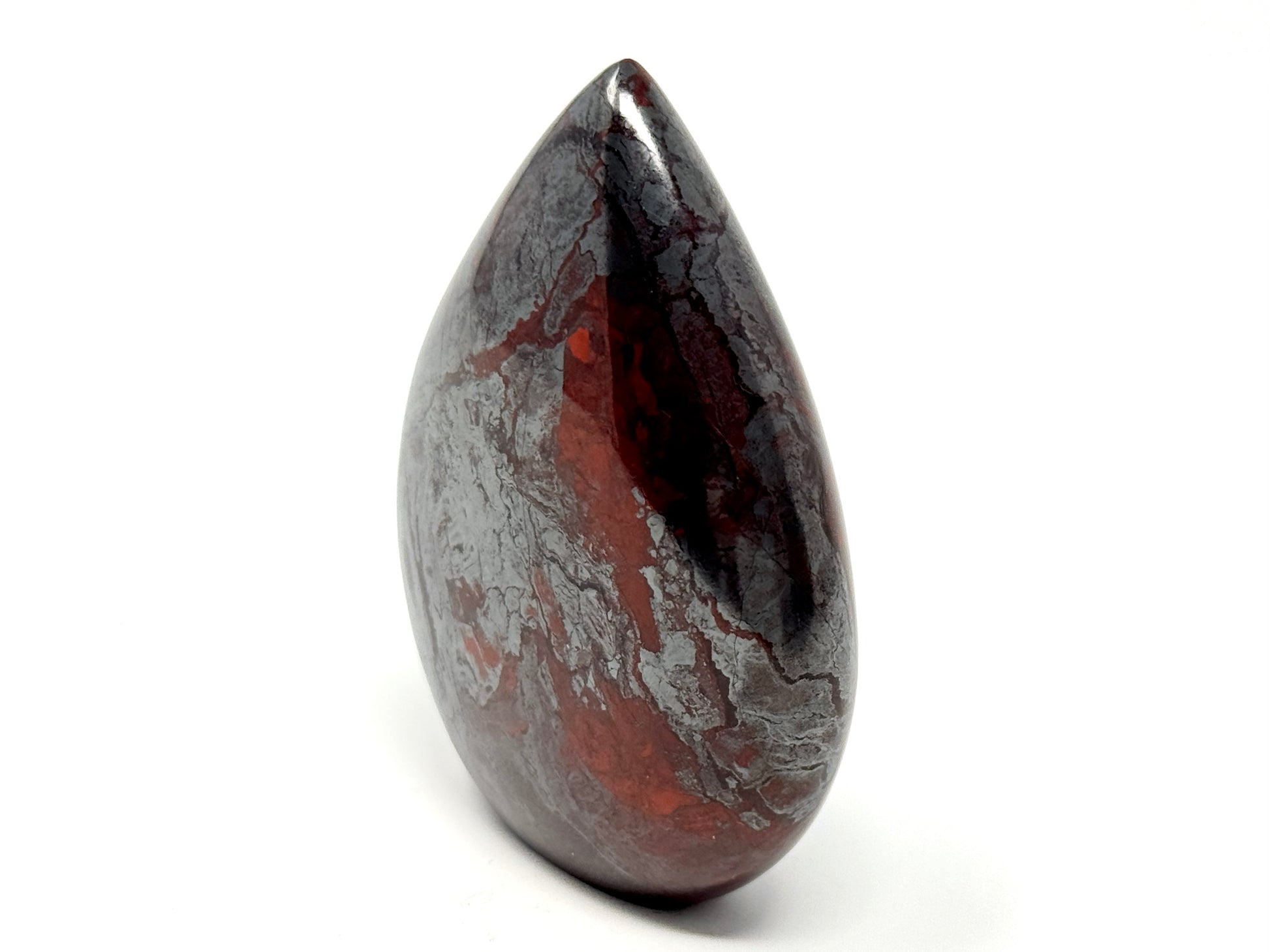 This unique Free-Standing Jaspilite Freeform Shape measuring 7.5cm tall displays a gorgeous mixture of vibrant Red Jasper and glistening, metallic Silver Hematite in striking swirling patterns.