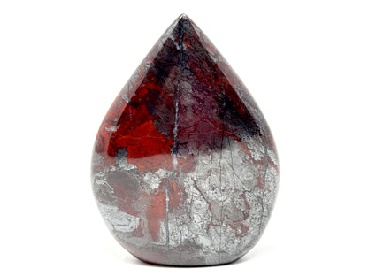 This unique Free-Standing Jaspilite Freeform Shape measuring 11.5cm tall displays a gorgeous mixture of vibrant Red Jasper and glistening, metallic Silver Hematite in striking swirling patterns.