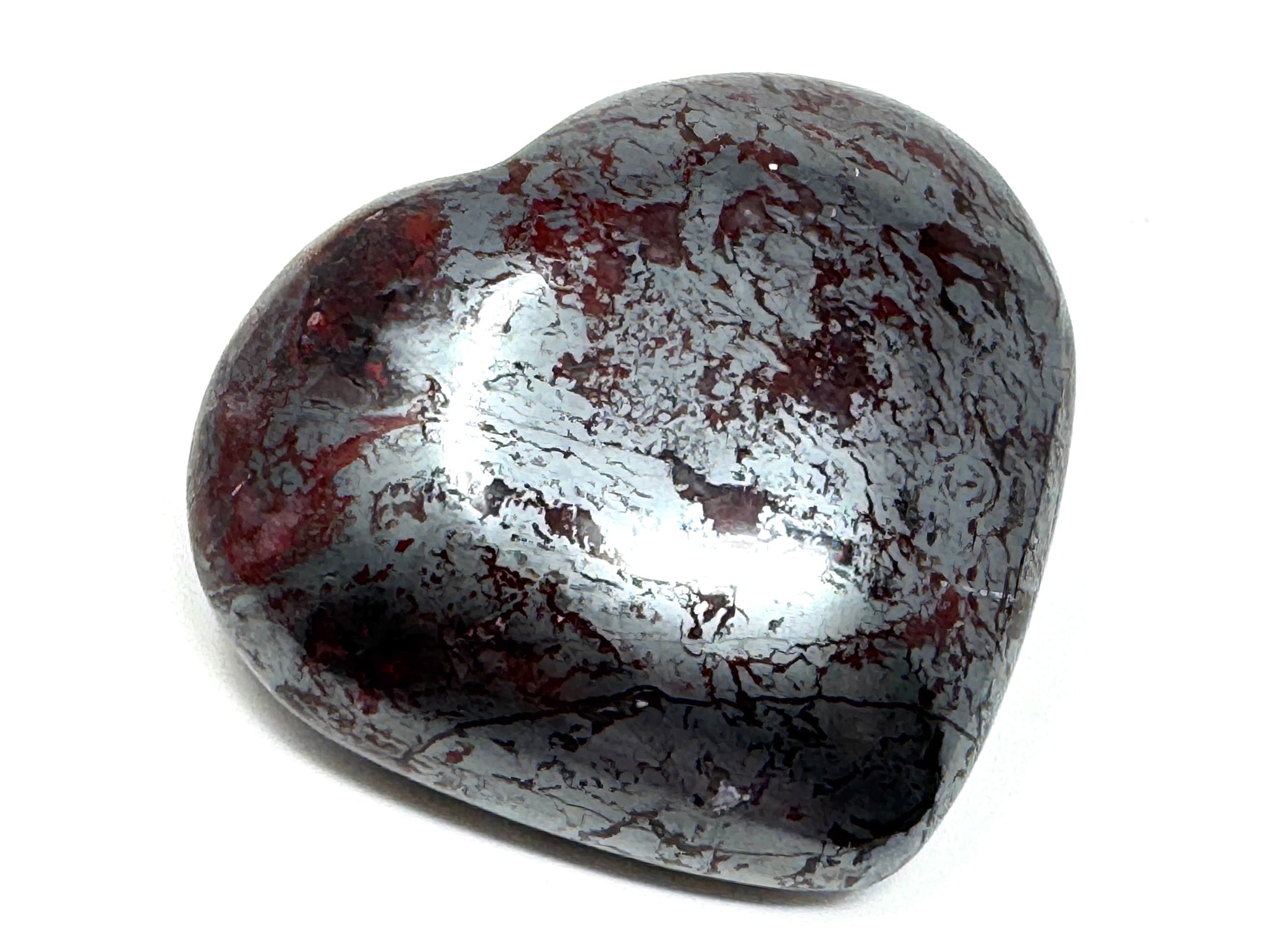 This unique and unusual Jaspilite Crystal Heart or Jaspilite Heart Crystal measuring 5.8cm wide displays a gorgeous mixture of vibrant Red Jasper and glistening, metallic Silver Hematite in striking swirling patterns.