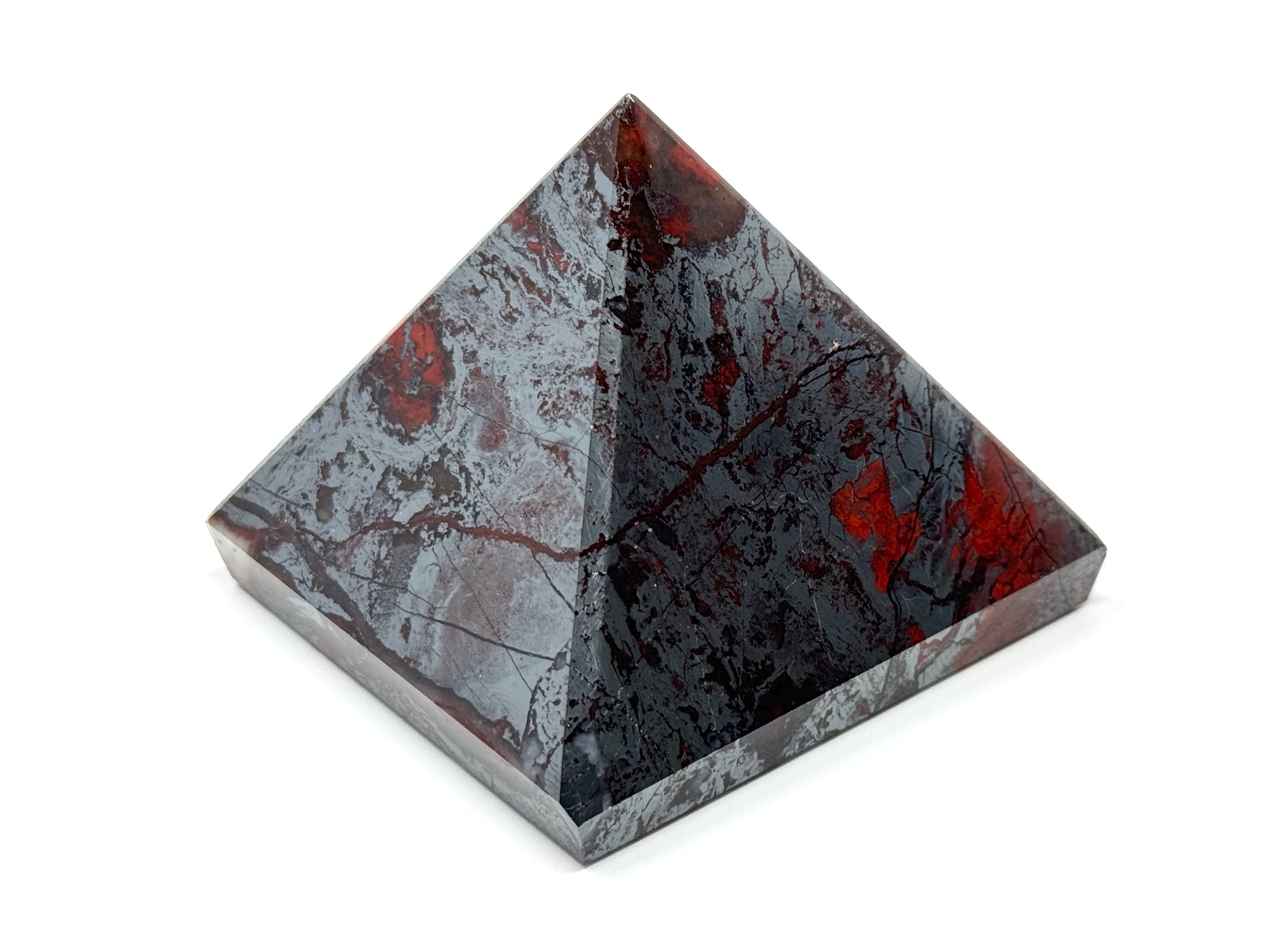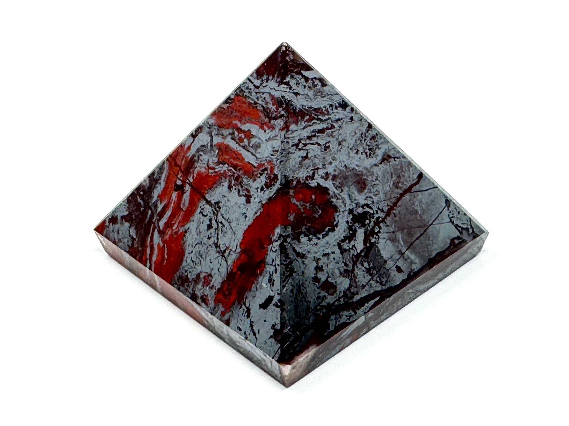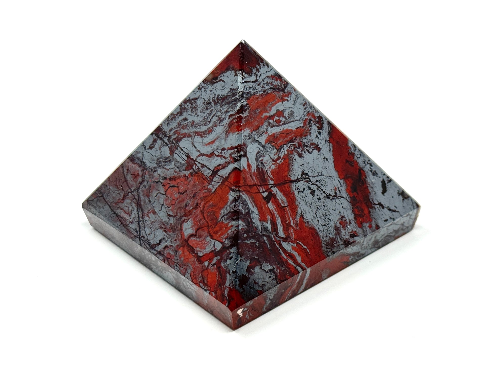 This unique Jaspilite Pyramid measuring 6.3cm wide displays a gorgeous mixture of vibrant Red Jasper and glistening, metallic Silver Hematite in striking swirling patterns.