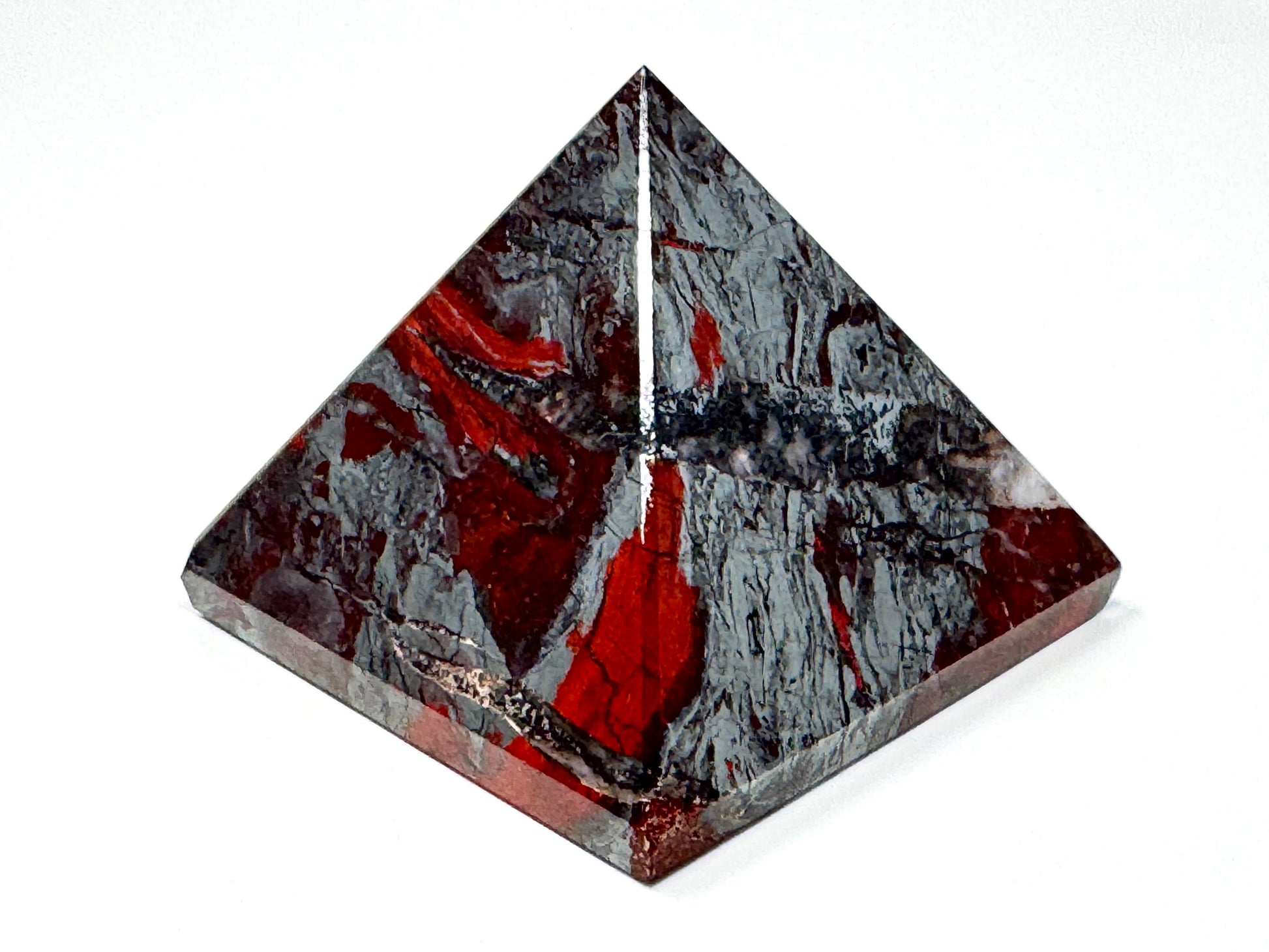 This unique Jaspilite Pyramid measuring 6.9cm wide displays a gorgeous mixture of vibrant Red Jasper and glistening, metallic Silver Hematite in striking swirling patterns.
