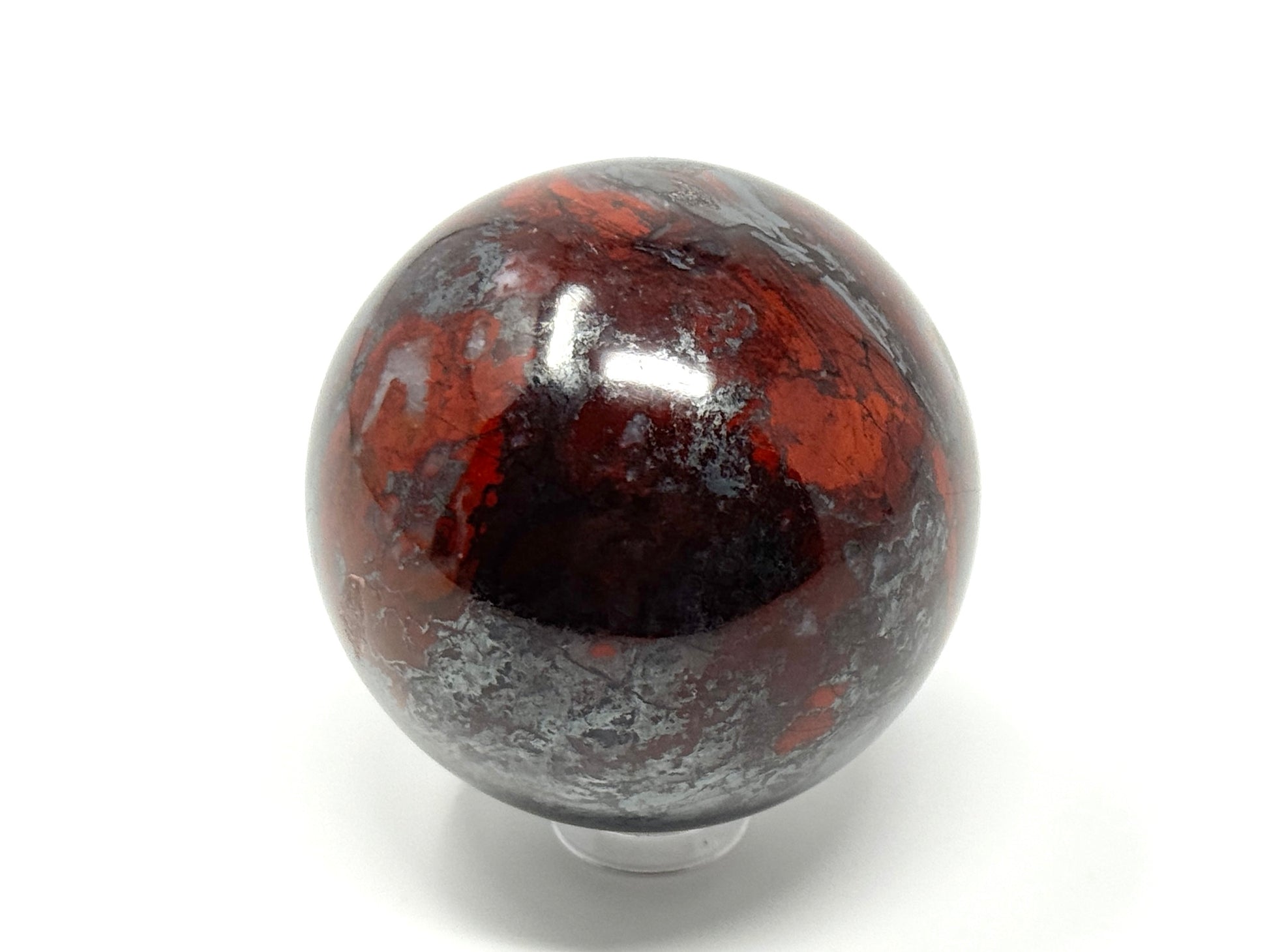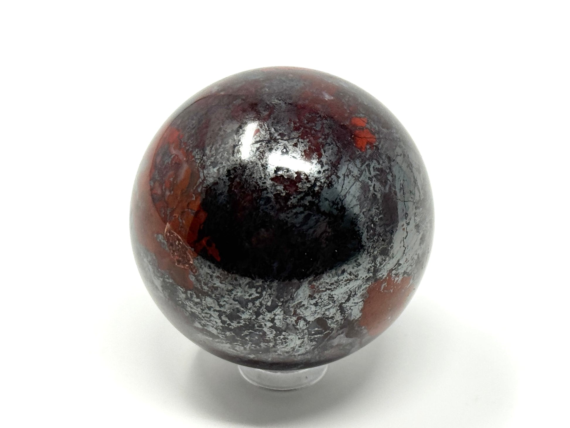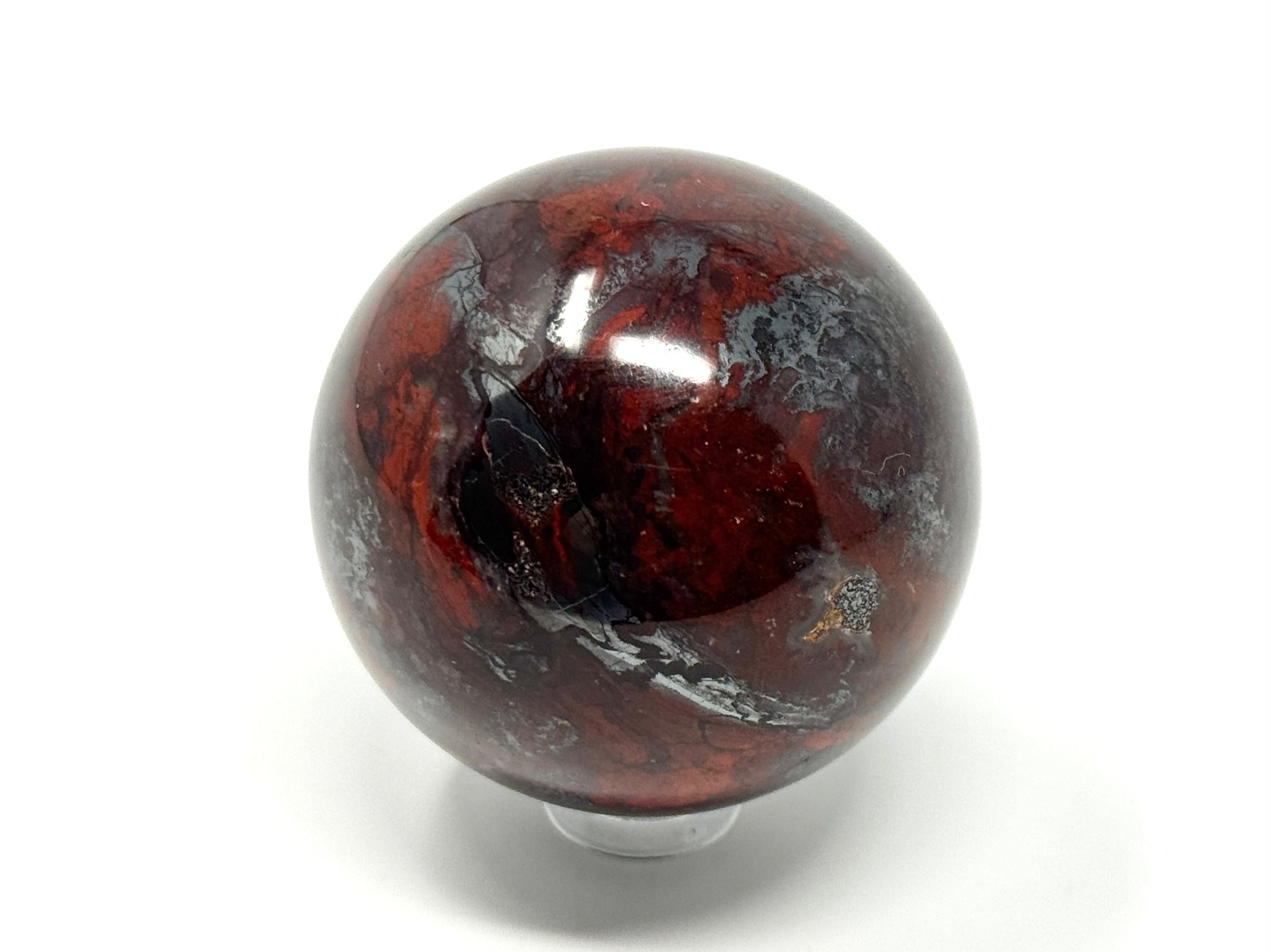 This unique Jaspilite Sphere measuring 5cm in diameter displays a gorgeous mixture of vibrant Red Jasper and glistening, metallic Silver Hematite in striking swirling patterns.