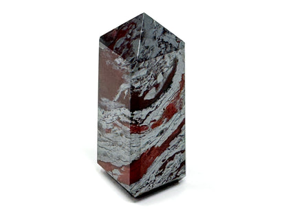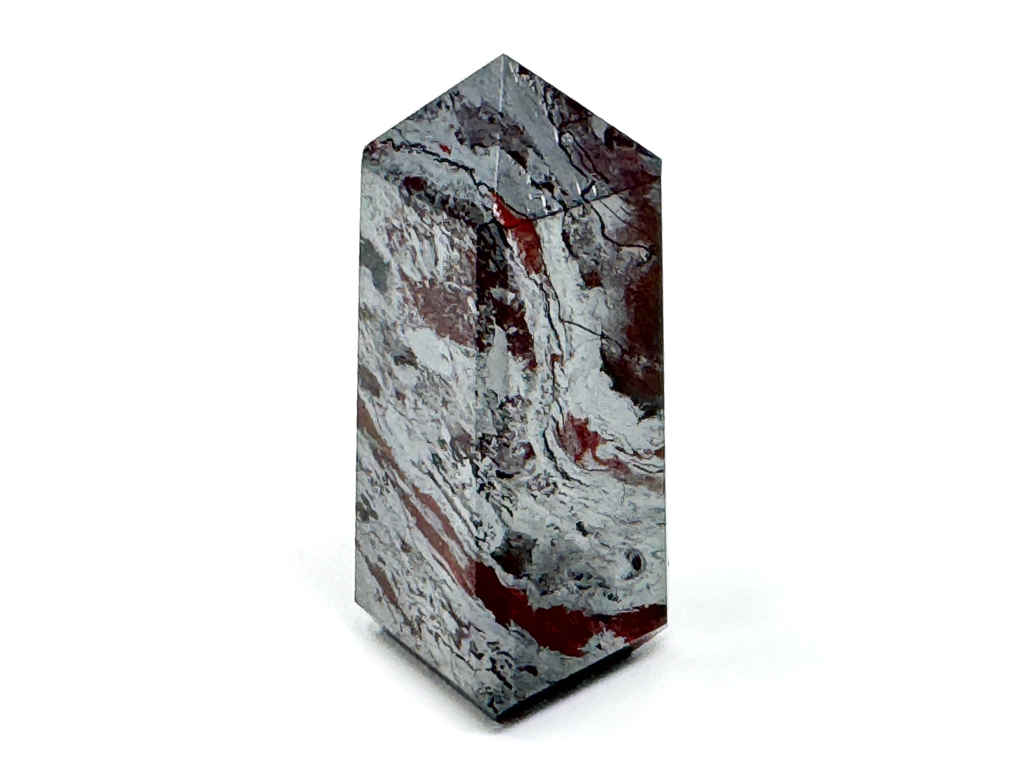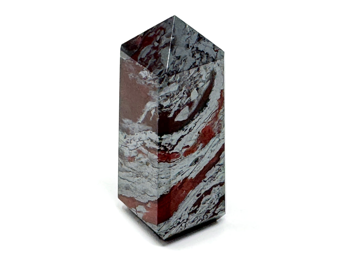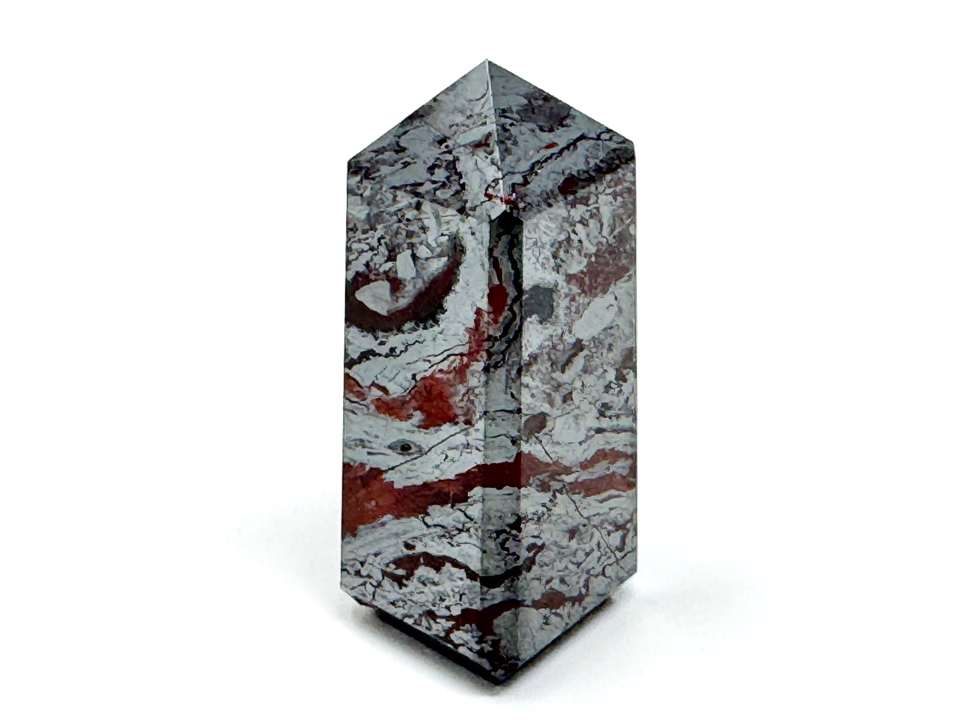 This unique Jaspilite Tower or Jaspilite Obelisk measuring 5.3cm tall displays a gorgeous mixture of vibrant Red Jasper and glistening, metallic Silver Hematite in striking swirling patterns.