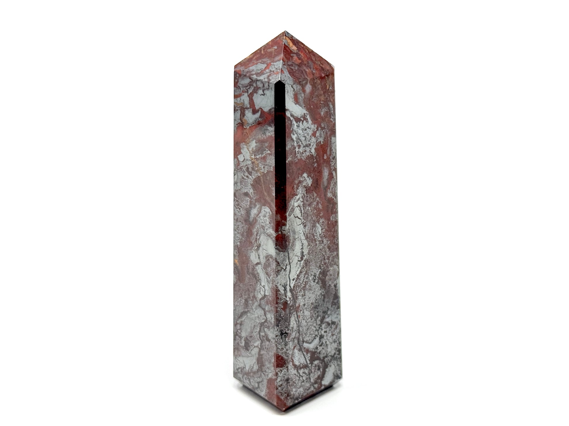The raw, natural Jaspilite Rock has been cut and polished by hand into a crystal tower shape or crystal obelisk shape which is perfect for home decor as a crystal display piece.