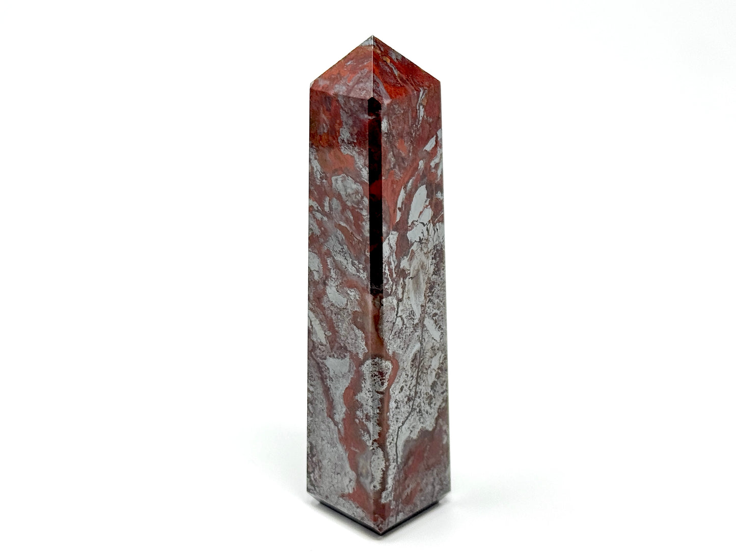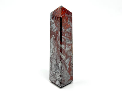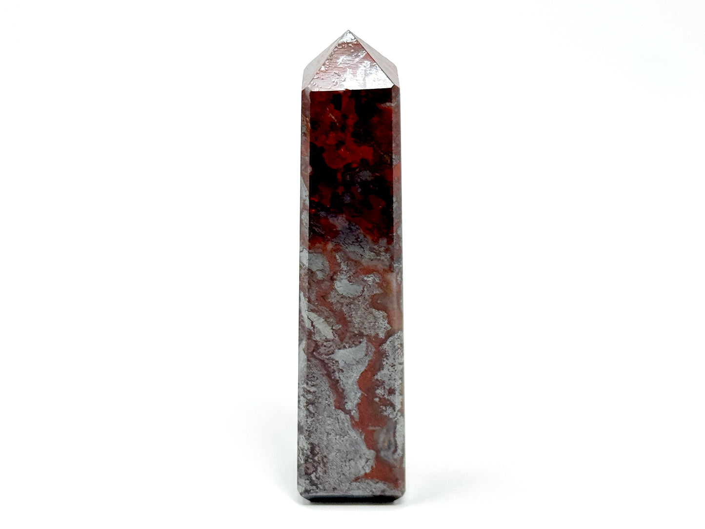 This unique Jaspilite Tower or Jaspilite Obelisk measuring 10cm tall displays a gorgeous mixture of vibrant Red Jasper and glistening, metallic Silver Hematite in striking swirling patterns.