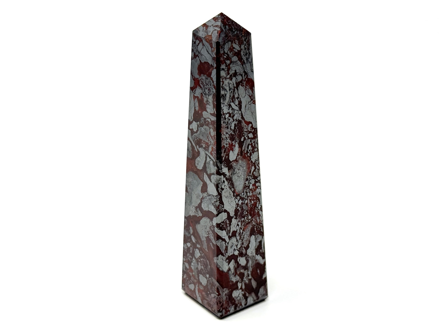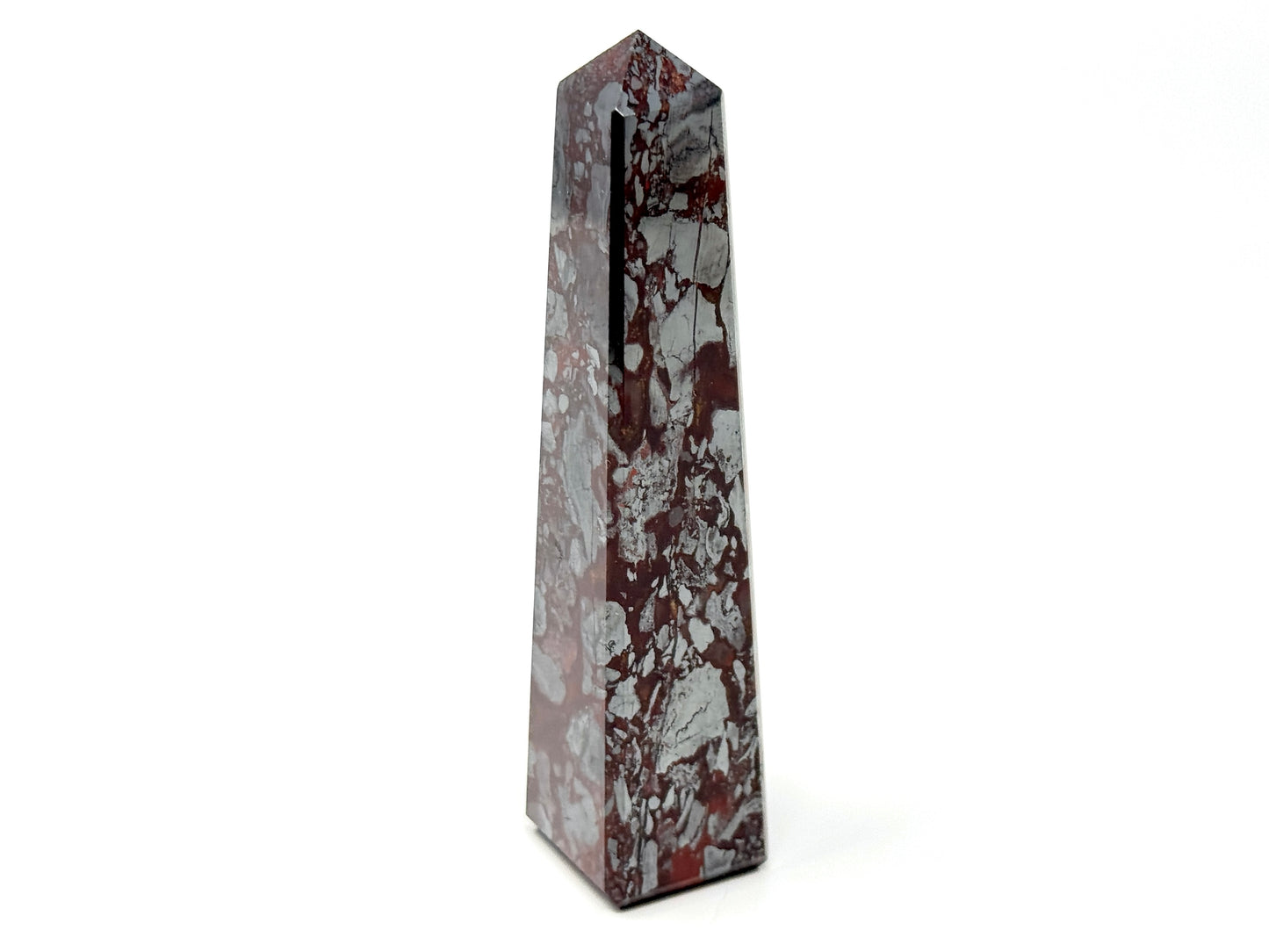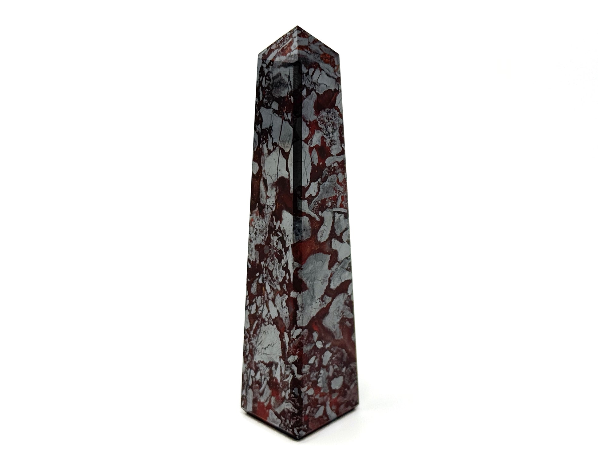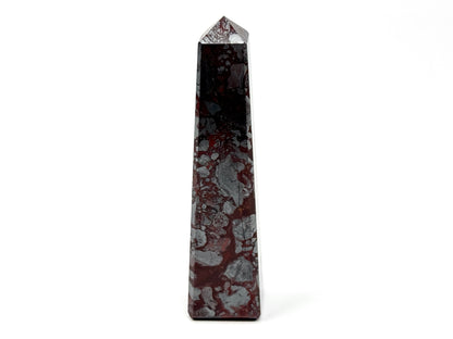 The raw, natural Jaspilite Rock has been cut and polished by hand into a crystal tower shape or crystal obelisk shape which is perfect for home decor as a crystal display piece.