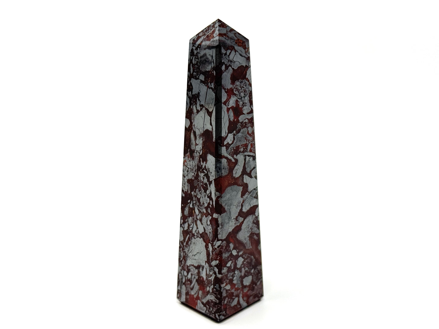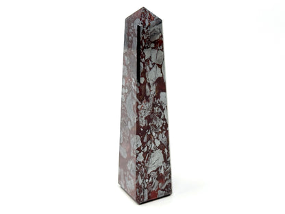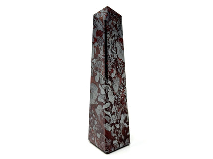 This unique Jaspilite Tower or Jaspilite Obelisk measuring 10.3cm tall displays a gorgeous mixture of vibrant Red Jasper and glistening, metallic Silver Hematite in striking swirling patterns.