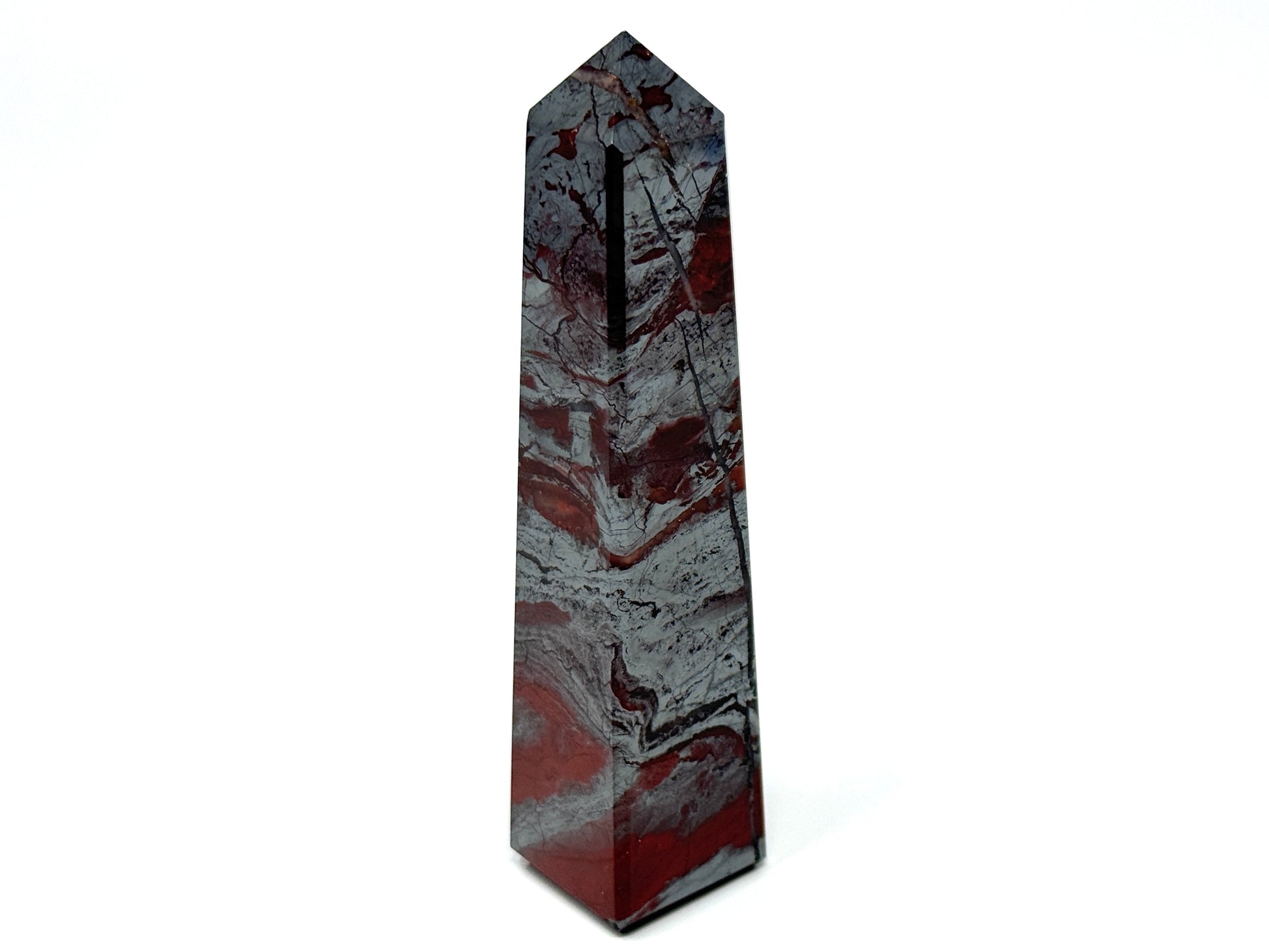This unique and classy Jaspilite Tower or Jaspilite Obelisk measuring 11.4 cm tall displays a gorgeous mixture of vibrant Red Jasper and glistening, metallic Silver Hematite in striking swirling patterns.