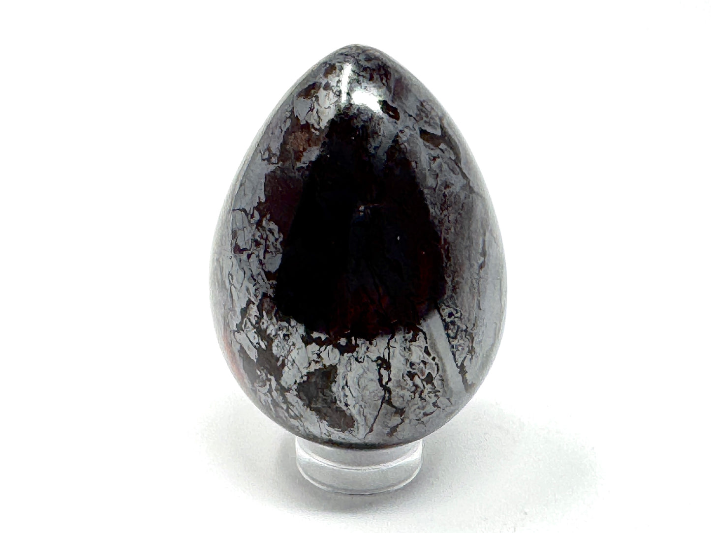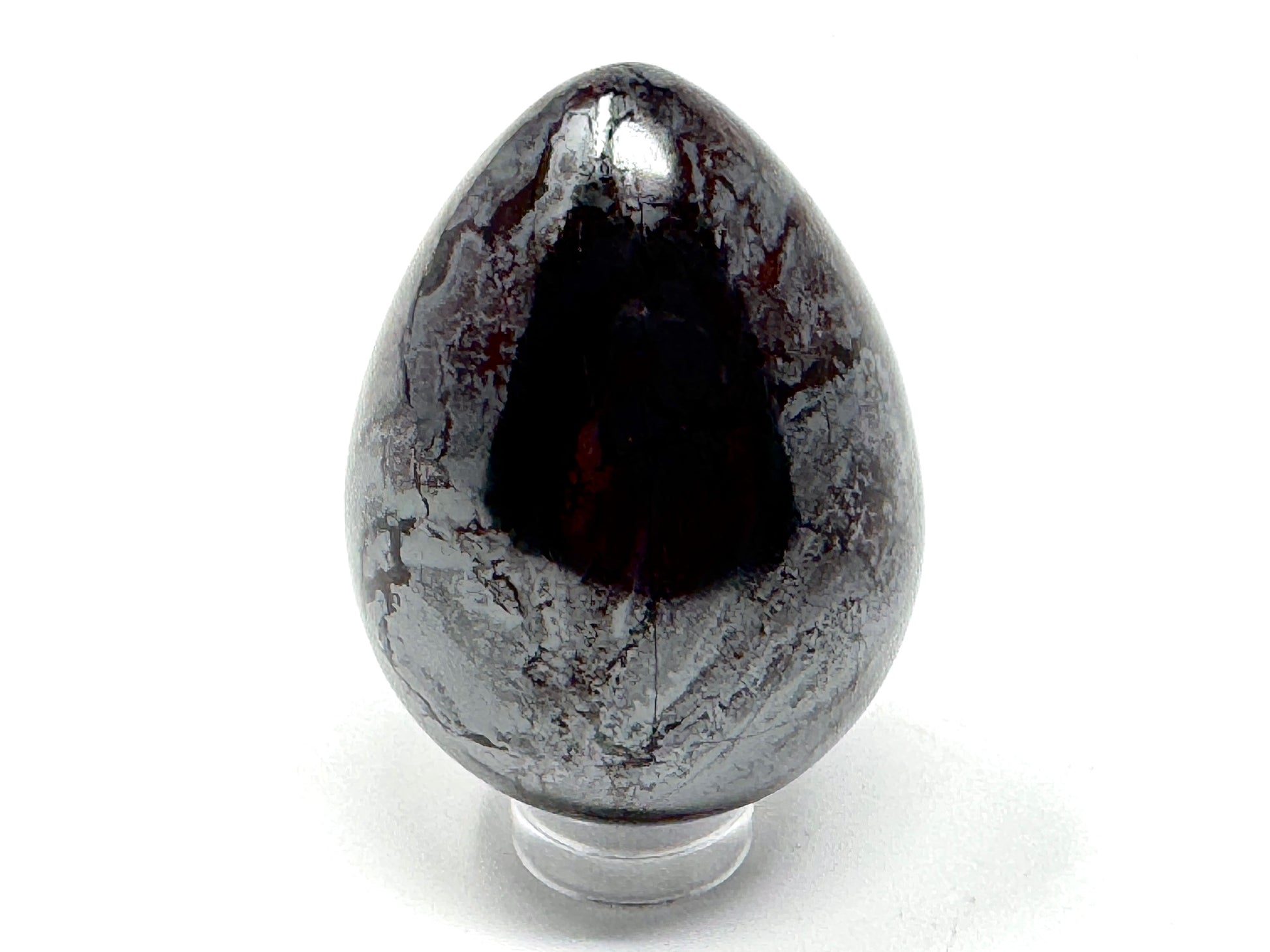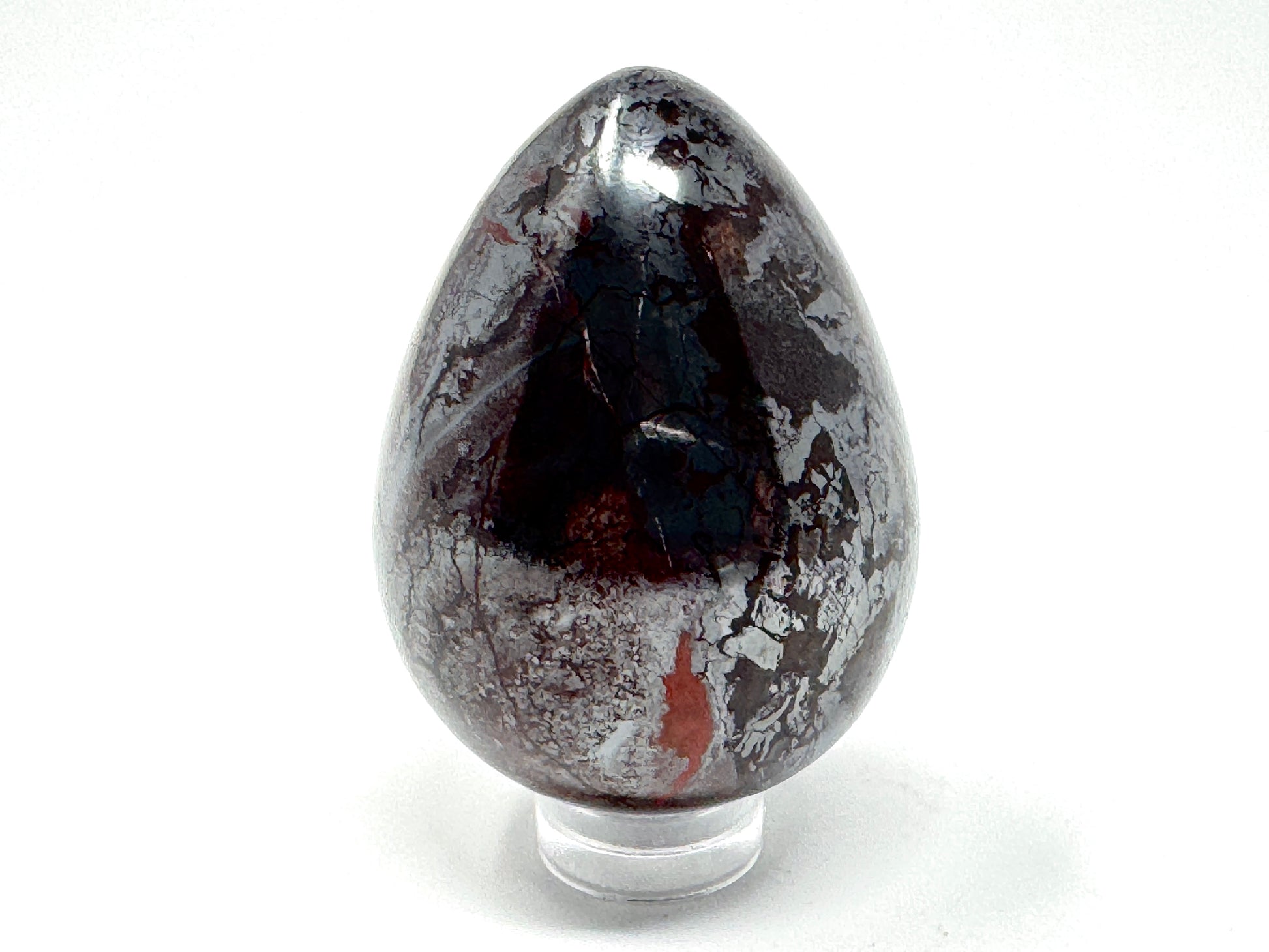 This unique Jaspilite Crystal Egg measuring 5cm tall displays a gorgeous mixture of vibrant Red Jasper and glistening, metallic Silver Hematite in striking swirling patterns.