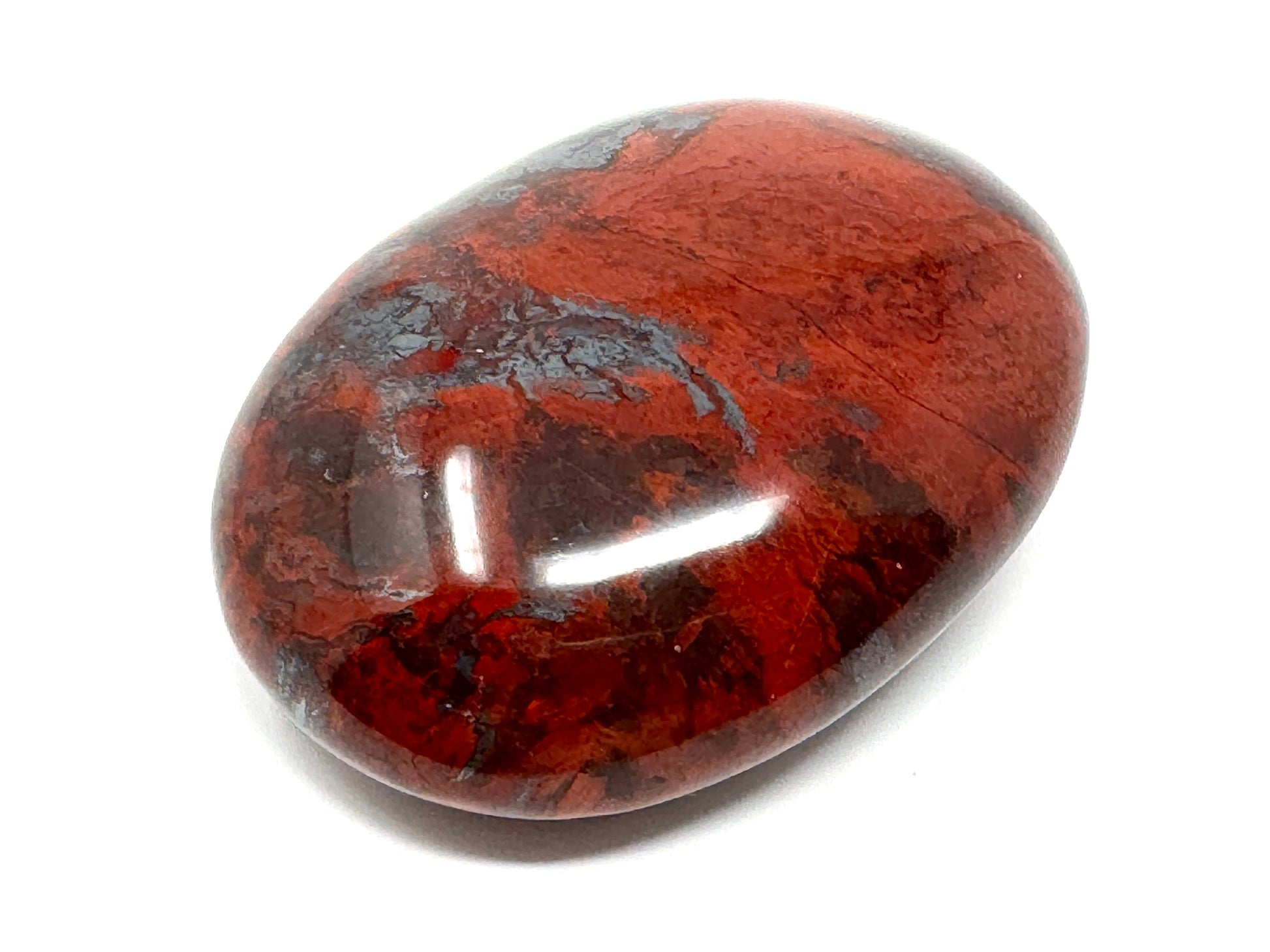 The raw, natural Jaspilite Rock has been cut and polished by hand into a tactile oval crystal pebble shape or crystal palm stone shape which is perfect to hold in the hand.