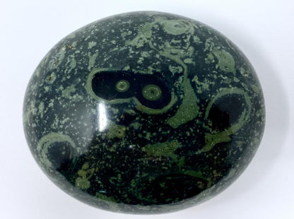 This gorgeous Kambaba Jasper Crystal Pebble (or Kambaba Jasper Palm Stone) measuring 6cm long displays a base of rich green colours topped with streaks and swirls of darker green and inky black in striking orb patterns.