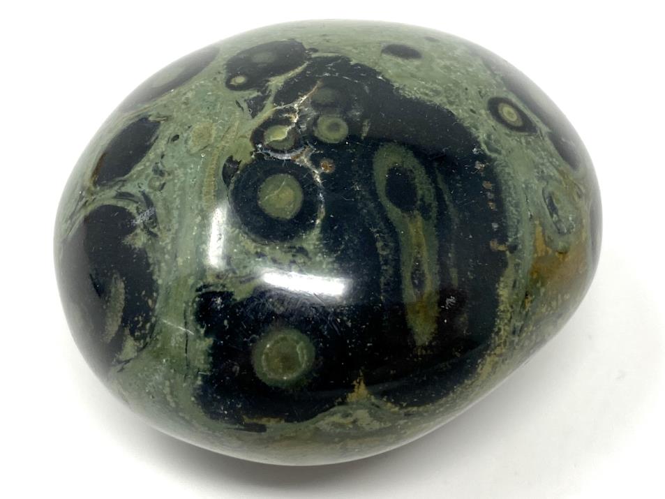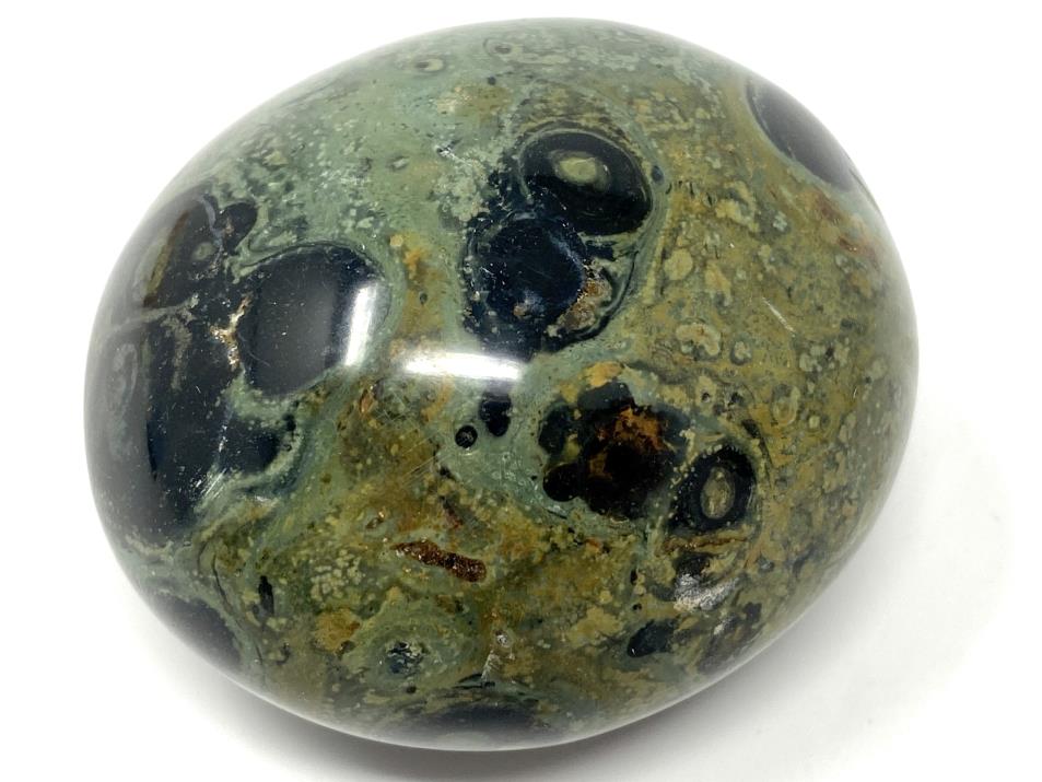 This gorgeous Kambaba Jasper Crystal Pebble (or Kambaba Jasper Palm Stone) measuring 5.9cm long displays a base of rich green colours topped with streaks and swirls of darker green and inky black in striking orb patterns.