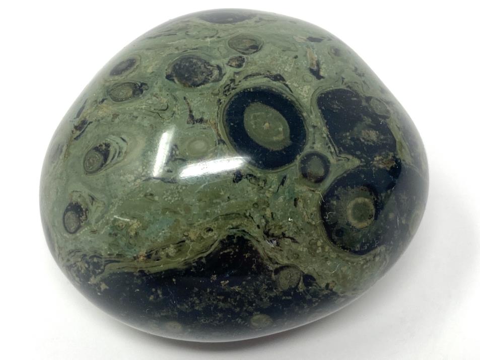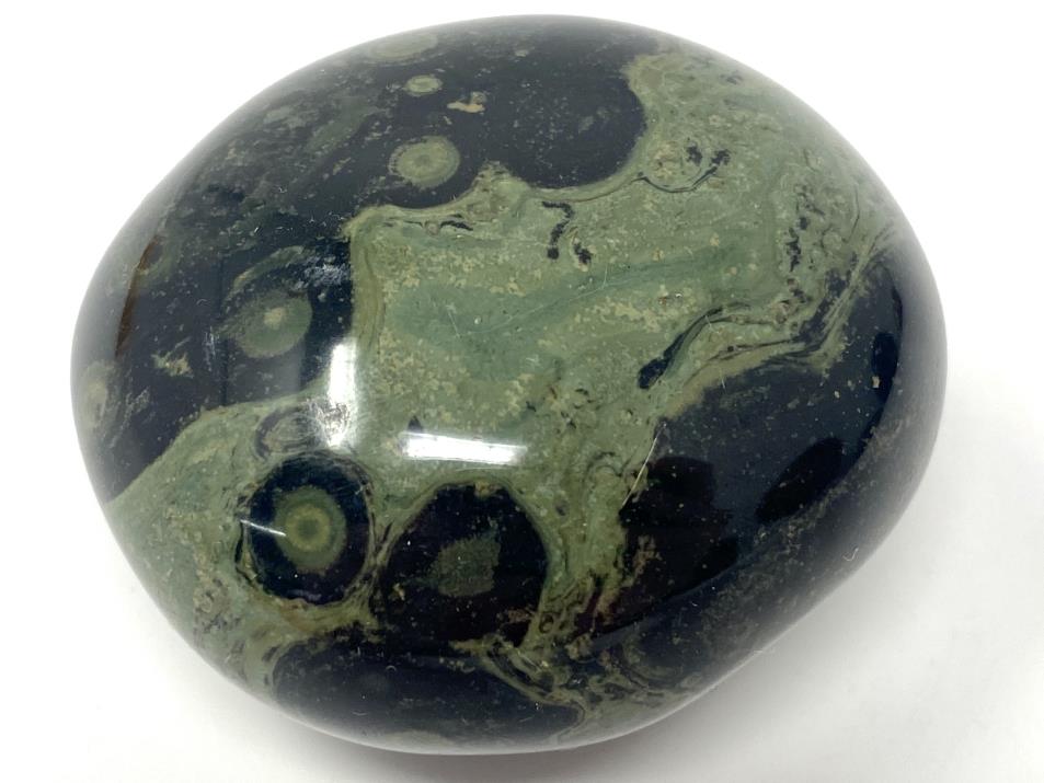 This gorgeous Kambaba Jasper Crystal Pebble (or Kambaba Jasper Palm Stone) measuring 5.8cm long displays a base of rich green colours topped with streaks and swirls of darker green and inky black in striking orb patterns.