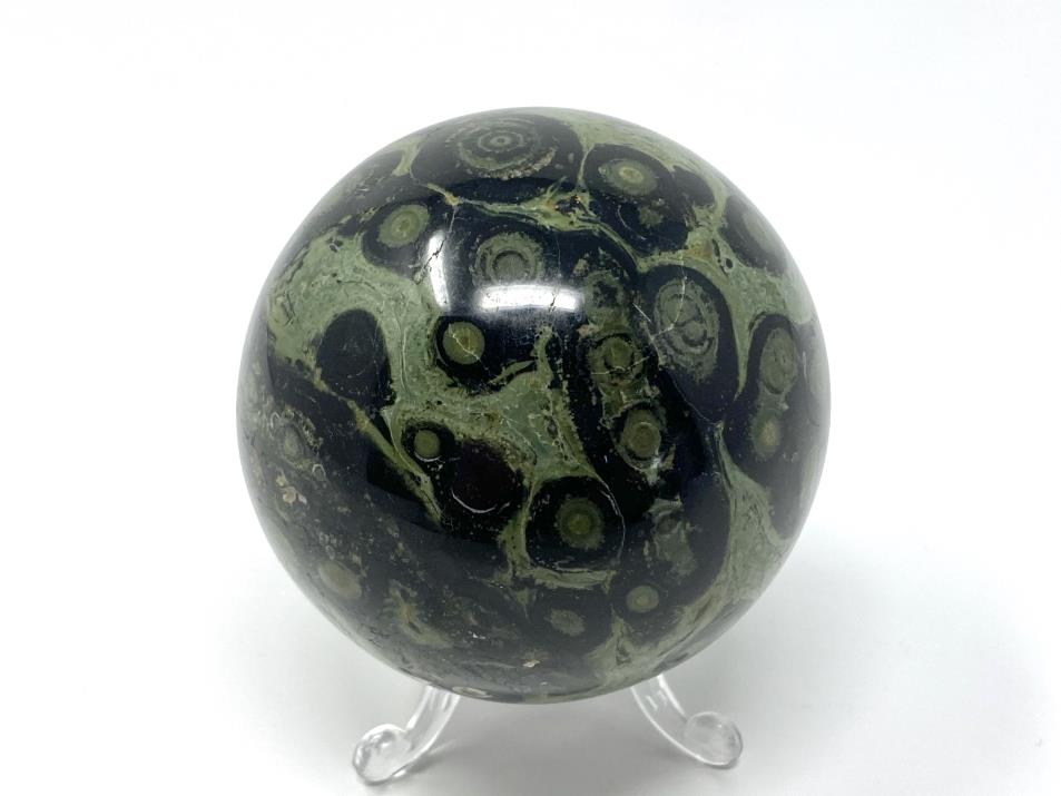 This gorgeous Kambaba Jasper Crystal Sphere (or Kambaba Jasper Crystal Ball) measuring 7.7cm in diameter displays a base of rich green colours topped with streaks and swirls of darker green and inky black in striking orb patterns.