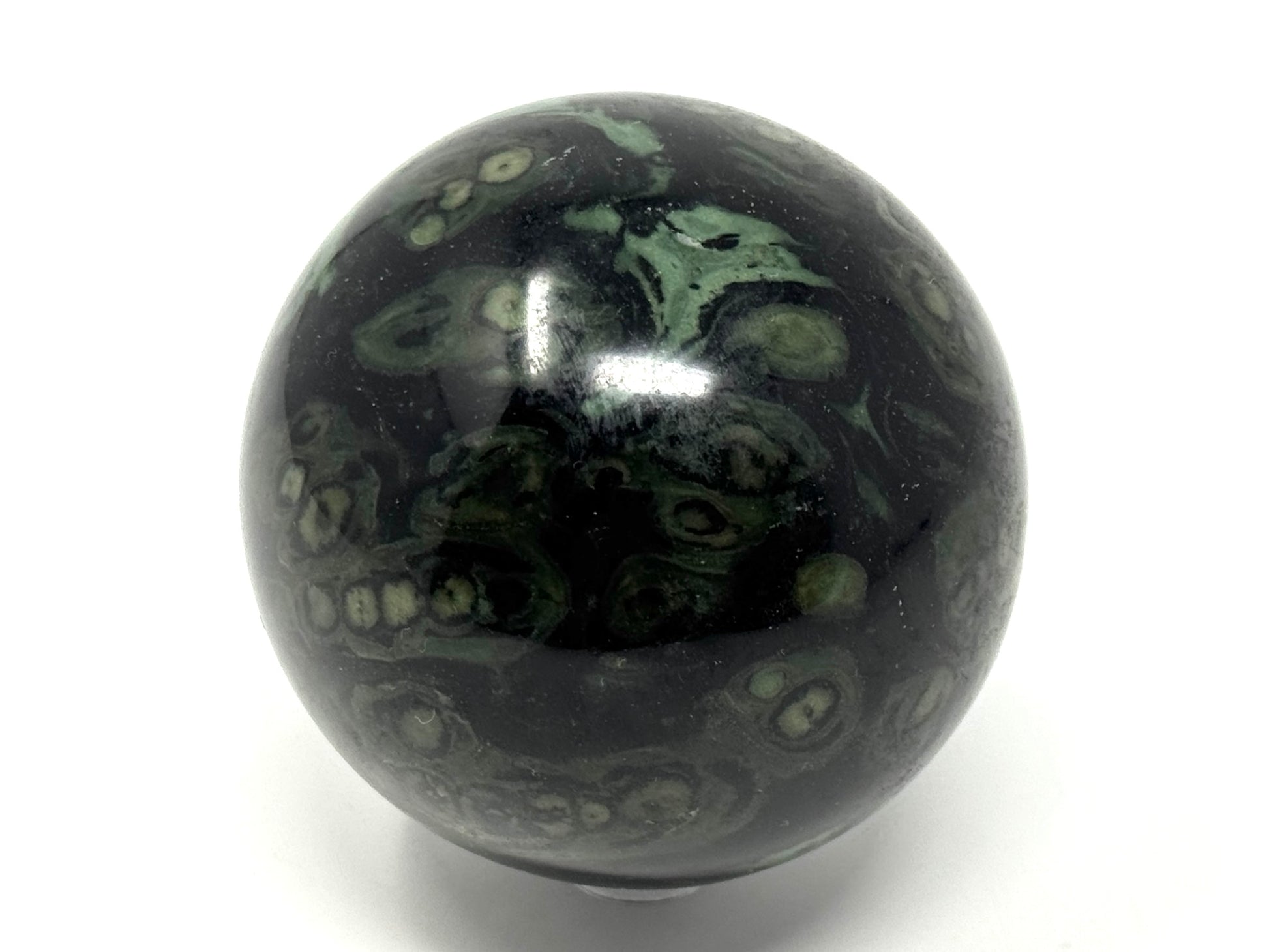 This lovely Kambaba Jasper Crystal Sphere (or Kambaba Jasper Crystal Ball) measuring 7.1cm in diameter displays a base of rich green colours topped with streaks and swirls of darker green and inky black in striking orb patterns.