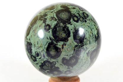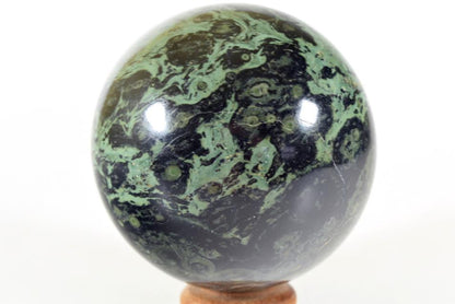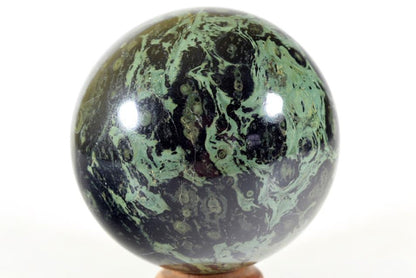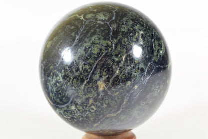 This gorgeous Large Kambaba Jasper Crystal Sphere (or Large Kambaba Jasper Crystal Ball) measuring 9cm in diameter displays a base of rich green colours topped with streaks and swirls of darker green and inky black in striking orb patterns.