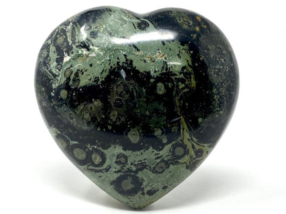 This gorgeous Large Kambaba Jasper Heart Crystal measuring 8.1cm wide displays a base of rich green colours topped with streaks and swirls of darker green and inky black in striking orb patterns.