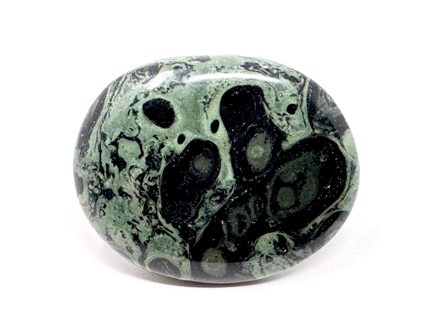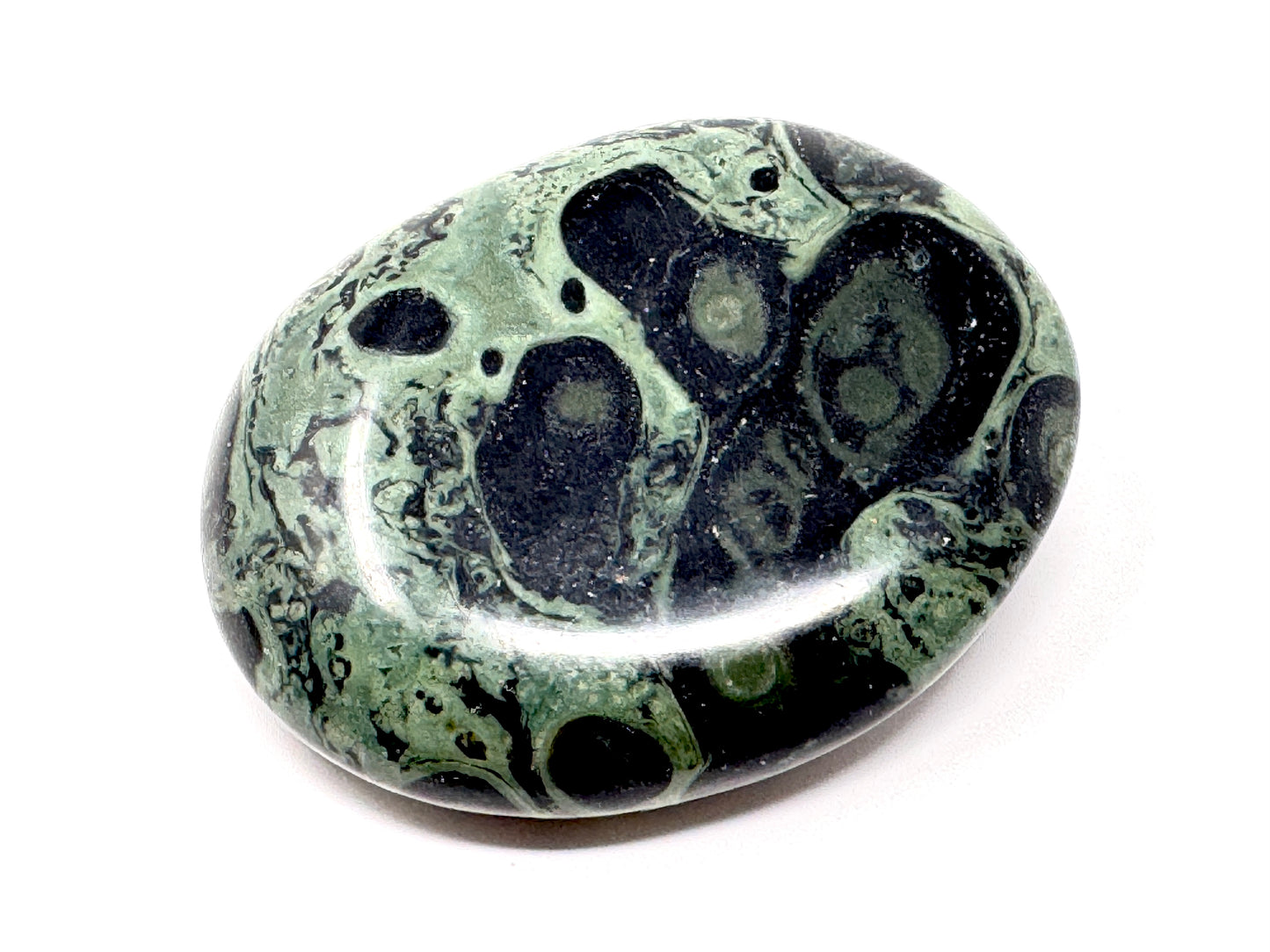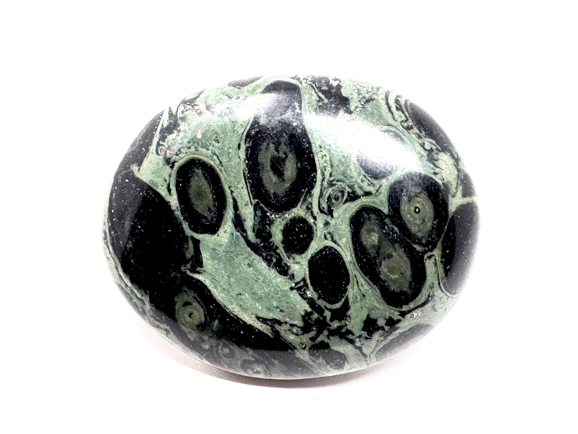 This gorgeous Kambaba Jasper Pebble (or Kambaba Jasper Palm Stone) measuring 6.7cm long is a hand-polished palm stone which displays a base of rich green colours topped with streaks and swirls of darker green and inky black in striking orb patterns.