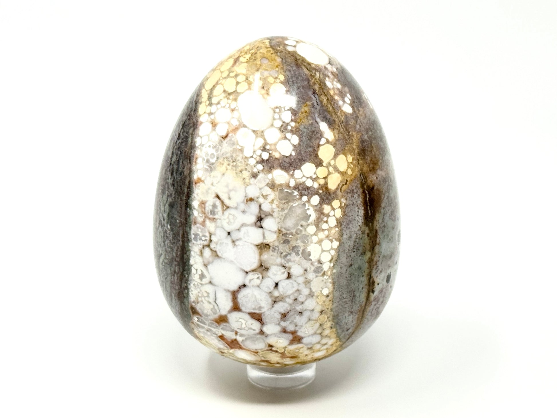 The King Cobra Jasper Crystal Egg displays a mixture of stunning beige, cream, white, and grey crystal orbs that contrast marvellously against each other in colour.