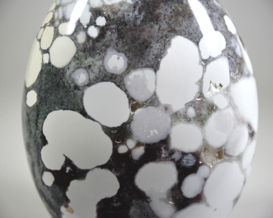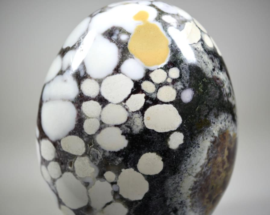 The orbs in its distinctive snakeskin pattern were created by spherical inclusions of radial aggregates that happen to be needle like accumulations of crystals within the stone.