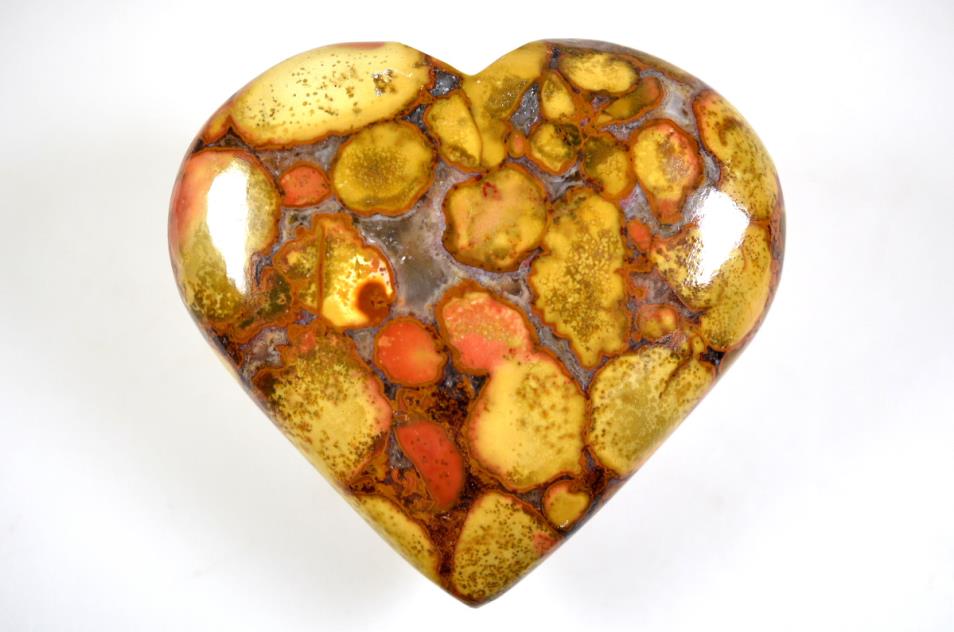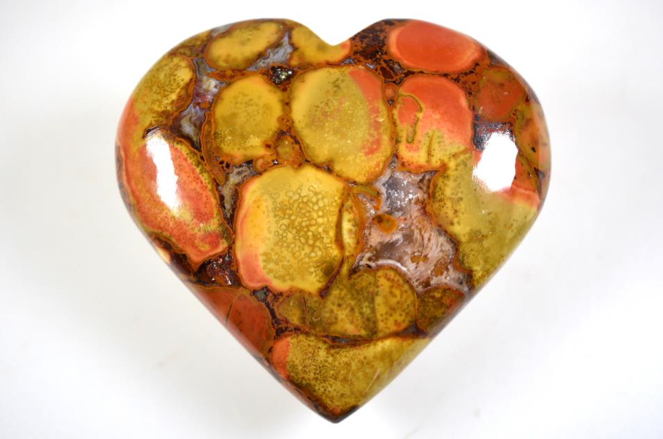 In this King Cobra Jasper Heart Shaped Stone, large orbs of vibrant orange, red, yellow, and rich brown contrast marvellously against each other.