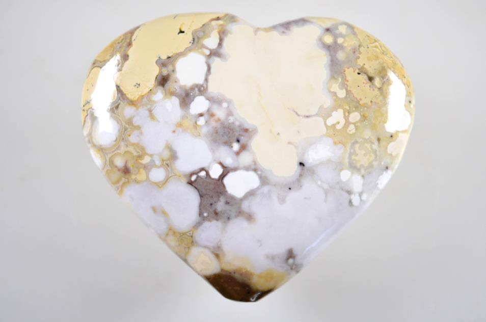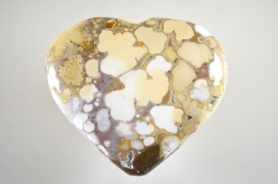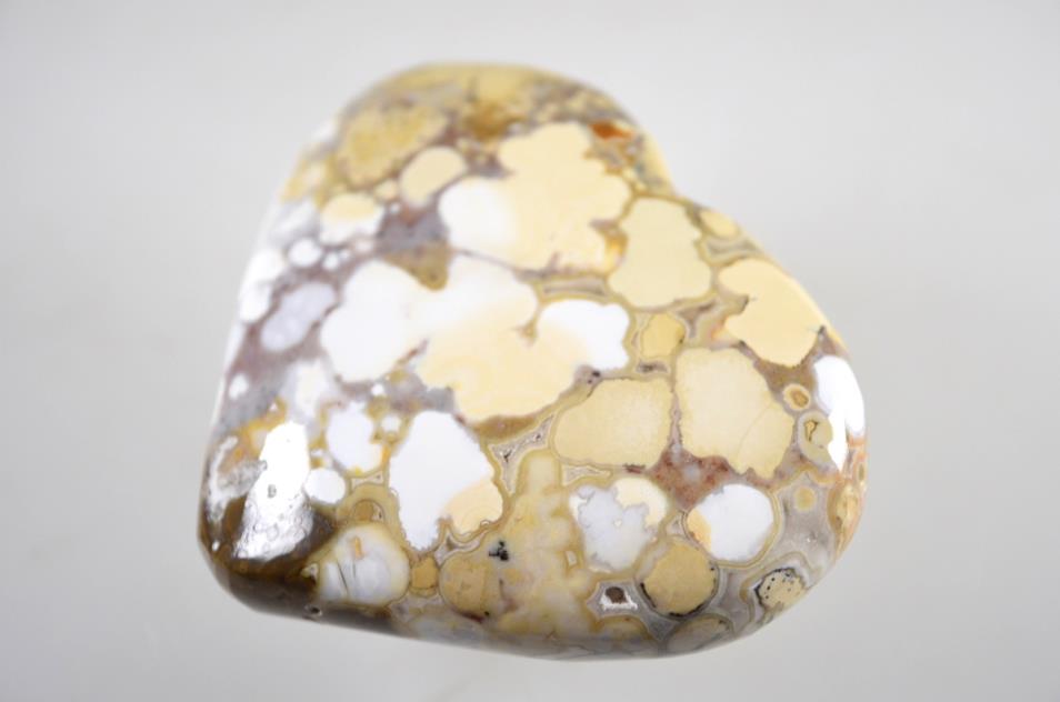 In this King Cobra Jasper Heart Shaped Stone, large orbs of cream, white, beige, caramel-brown and grey contrast marvellously against each other.