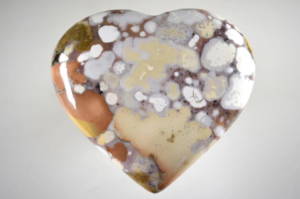 In this King Cobra Jasper Heart Shaped Stone, large orbs of grey, brown, white, and orange contrast marvellously against each other.
