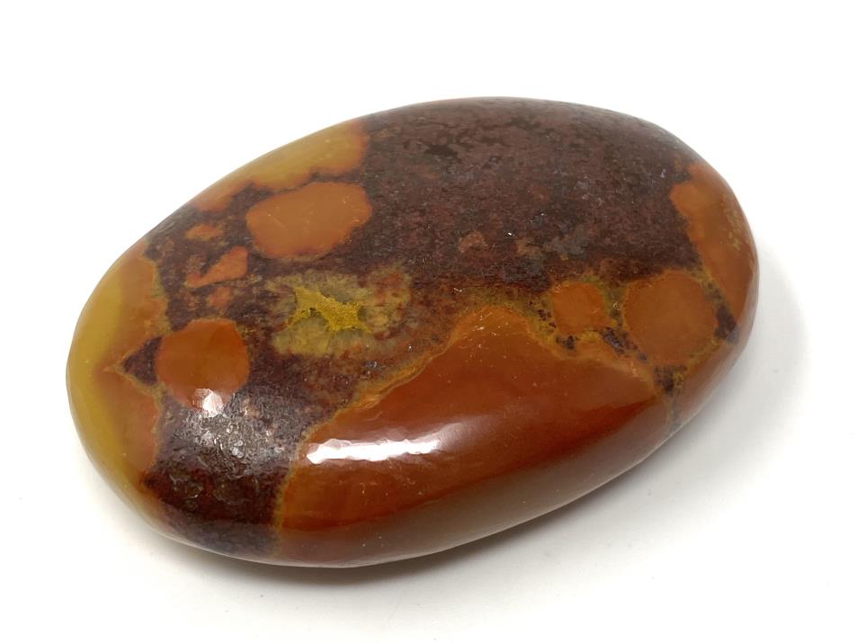 The King Cobra Jasper Pebble (also known as a King Cobra Jasper Palm Stone) showcases vivid, fiery hues of Red Jasper, Orange Jasper, and Brown Jasper, colours which contrast strikingly against each other.