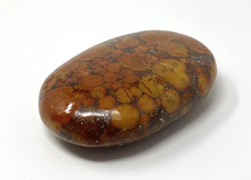 The King Cobra Jasper Pebble (also known as a King Cobra Jasper Palm Stone) showcases vivid, fiery hues of Red Jasper, Orange Jasper, and Brown Jasper, colours which contrast strikingly against each other.