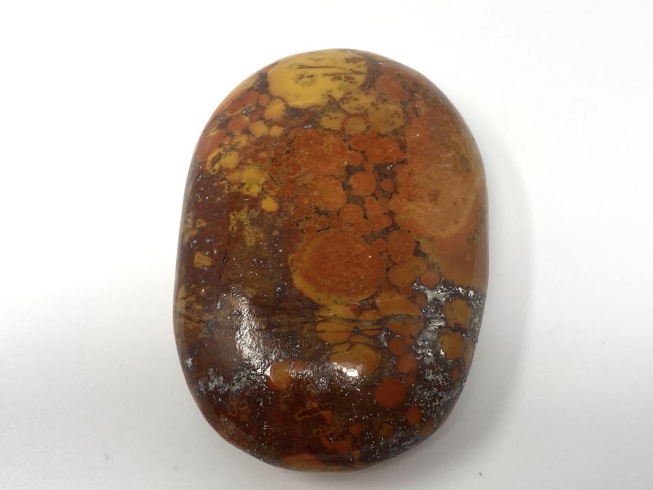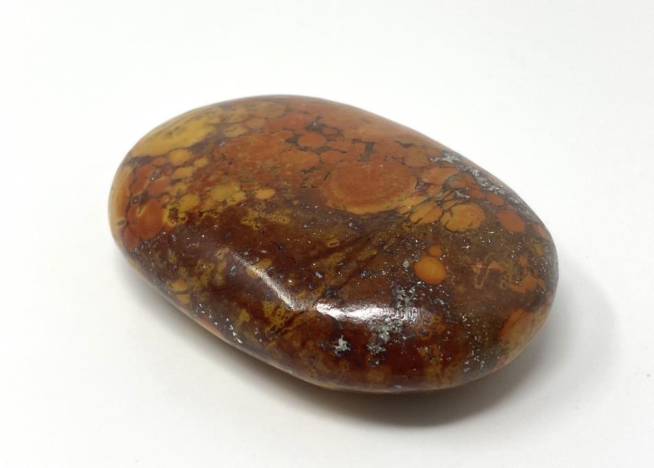This gorgeous King Cobra Jasper Crystal Pebble measuring 6.5cm long has been carefully cut and polished into an oval crystal pebble shape (oval palm stone shape) from natural King Cobra Jasper Stone, and displays a unique orb pattern in exquisite colours.
