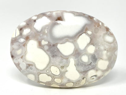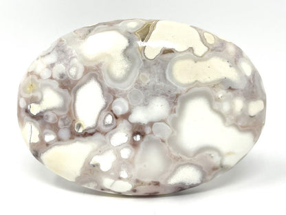 In this King Cobra Orbicular Jasper Crystal, large orbs of bright white and beige-tinted cream contrast marvellously against a grey backdrop.