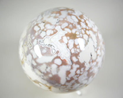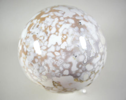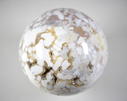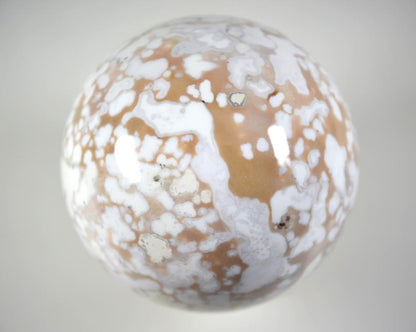 King Cobra Jasper Sphere, crystal for sale from India. This glorious King Cobra Jasper sphere is 8.5cm diameter and displays a unique orb pattern with rich colours.This amazing newly found rare Jasper stone is named King Cobra on account of its likeness with one of the deadliest snakes in the world. The look is sure to keep you mesmerised with the orbs on the surface of the crystal. The unique shades of colour of the crystal stand out from all other kinds of Jaspers found across the world. The glorious orbs are created by spherical inclusions of radial aggregates that happen to be needle like accumulation of crystals within the stone. Ranging from the palest of white to a rich maroon hue, there are Reds, yellows, oranges and browns in wonderful spaced patterns accounting for its eye catching appearance. The psychics and crystal healers of the world are reluctant to let go of this amazing Jasper that has also been christened as a counsellor’s stone. It is believed to have amazing metaphysical properties that can control the anger and tame the primal energy inducing balancing and calming to the user. It is also known to sharpen the senses and heal a number of ailments thus banishing the negativity completely from the body. Sure, it sounds fantastic but you would have to be a believer to unleash its energy. We have retained a small team of artisans who are working hard to keep up with the demand by cutting and polishing the stones so as to achieve the spectacular highly polished forms. Choose a piece of this amazing King of Jasper's that has been likened to the King of all reptiles a.k.a The King Cobra. A truly stunning addition for any collection. Or as a unique display piece in any home.