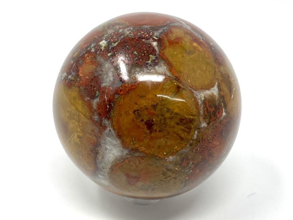 The King Cobra Jasper Crystal Sphere displays a mixture of vibrant volcanic red, vivid fiery orange, and warm burnt orange crystal orbs that contrast marvellously against each other and a stunning backdrop of swirling stone-greys and beige-browns in colour.
