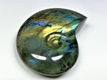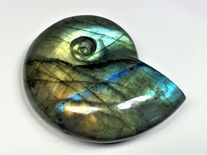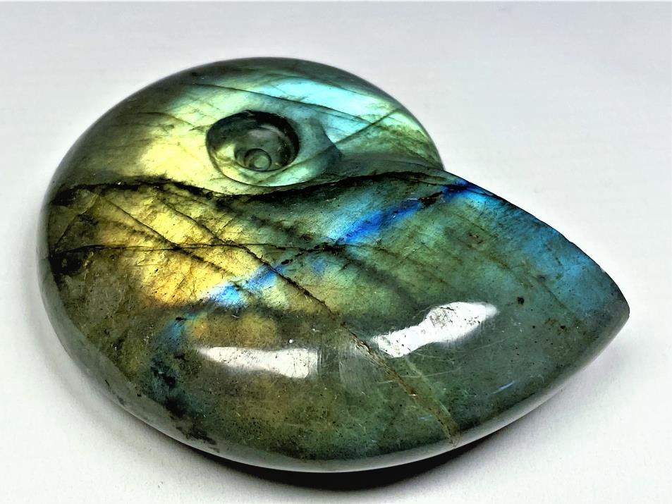 Labradorite Ammonite Carving, crystal for sale from Madagascar. Measuring 6cm long, this magnificent crystal has been carved into a stunning ammonite shape, and displays iridescent gold and blue colours shining from within the stone. Labradorite features a distinctive effect called labradorescence (also known as the Schiller Effect), which is the stone's famous property. When exposed to light, the gem shimmers and shines in a glorious array of colours.