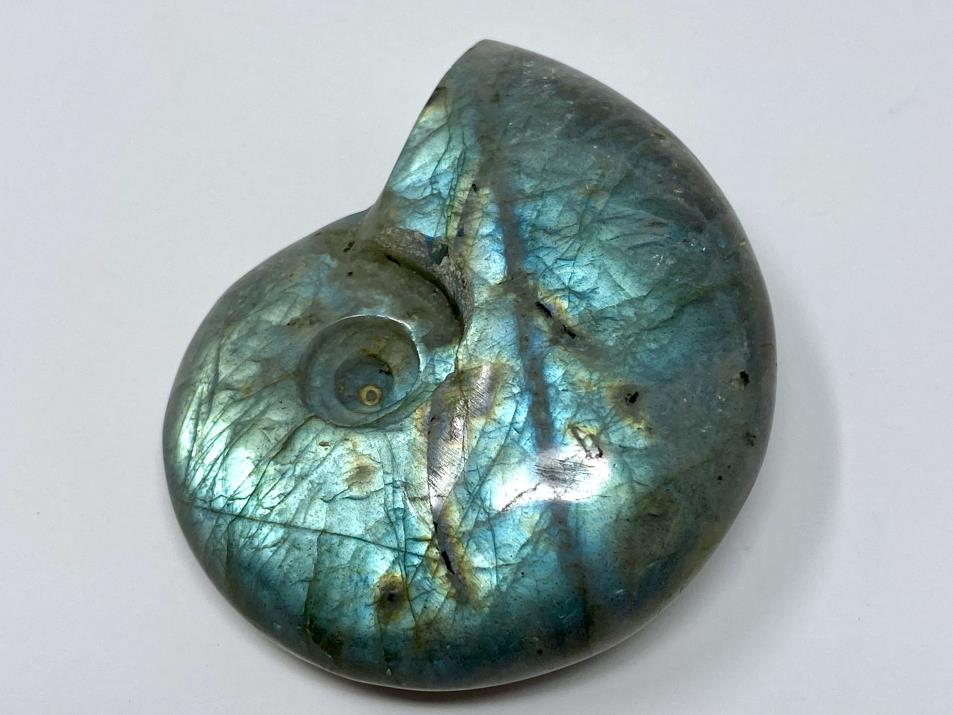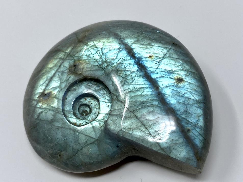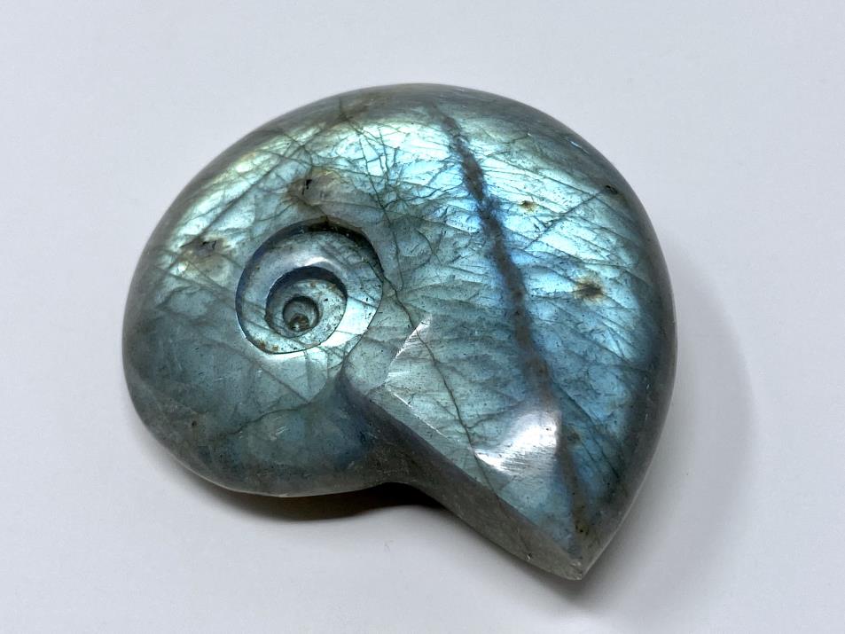 Labradorite Ammonite Carving, crystal for sale from Madagascar. Measuring 5.6cm long, this stunning stone has been carved by artisans into a striking ammonite shape, and displays iridescent gold and blue colours shining from within the stone. Labradorite features a distinctive effect called labradorescence (also known as the Schiller Effect), which is the stone's famous property. When exposed to light, the gem shimmers and shines in a glorious array of colours.