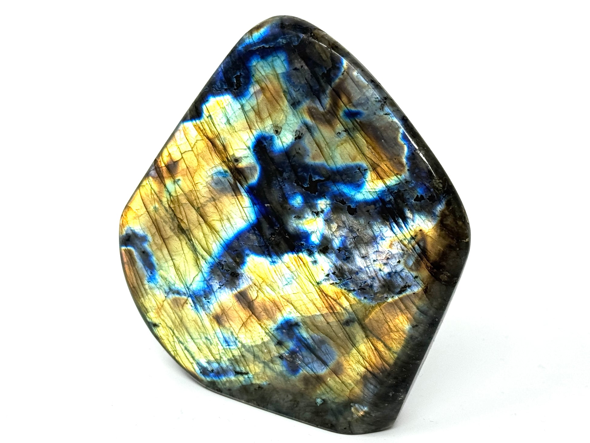 This Labradorite Free Shape displays iridescent gold and deep blue veins shining from within the stone to create an incredible flashy pattern.