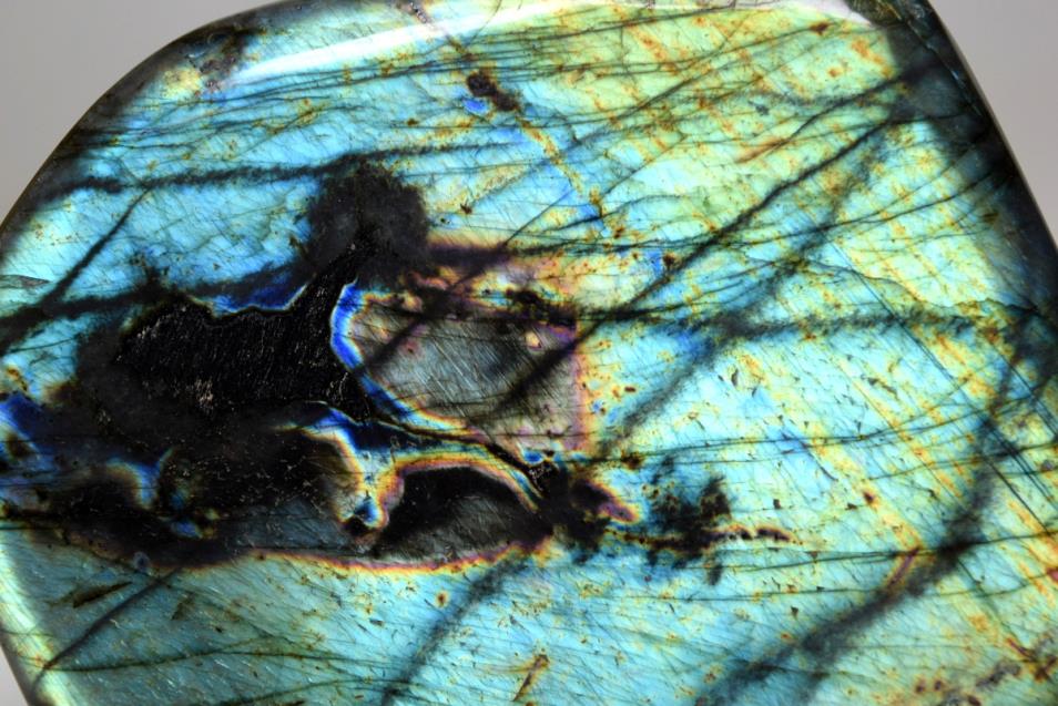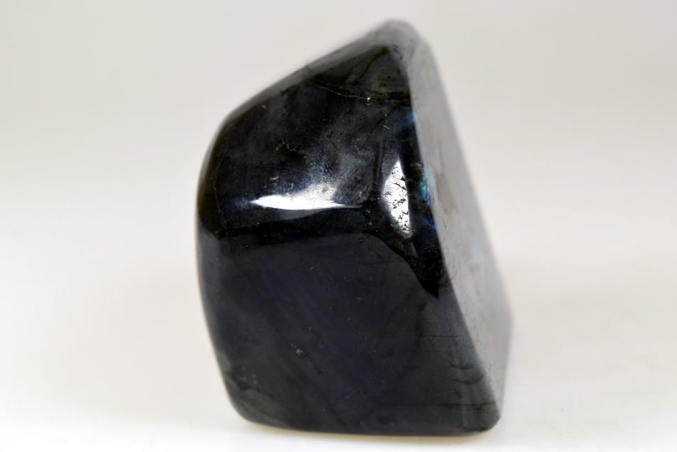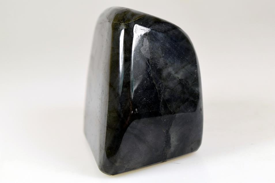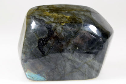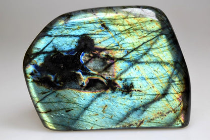 Labradorite Freeform, crystal for sale from Madagascar. This striking 9.2cm wide Labradorite Freeform displays a rich mix of green, blue and gold colours flashing from deep within the stone. The Labradorite is of the highest grade and has been sympathetically hand cut and polished to produce an impressive individual look. Excellent Labradorescence is shown also known as the schiller effect which is the stones famous property. When exposed to the light the gem becomes a shimmering tapestry of colour. Hand selected by ourselves in Madagascar this freeform is of the highest grade and its striking beauty will enchant you.The natives of Pauls island off the coast of Labrador have told the story of Labradorite for generations. The tale recounts a legendary Inuit warrior the first to discover that the Aurora Borealis had been stolen from the skyand imprisoned in the gem known as Labradorite, smashing the stone with his spear he returned the northern lights to their home, but some light remained eternally encased in the crystal. As legend has it this is how the phenomenon of Labradoresence came to be.