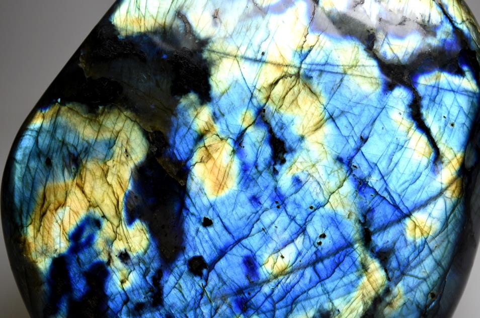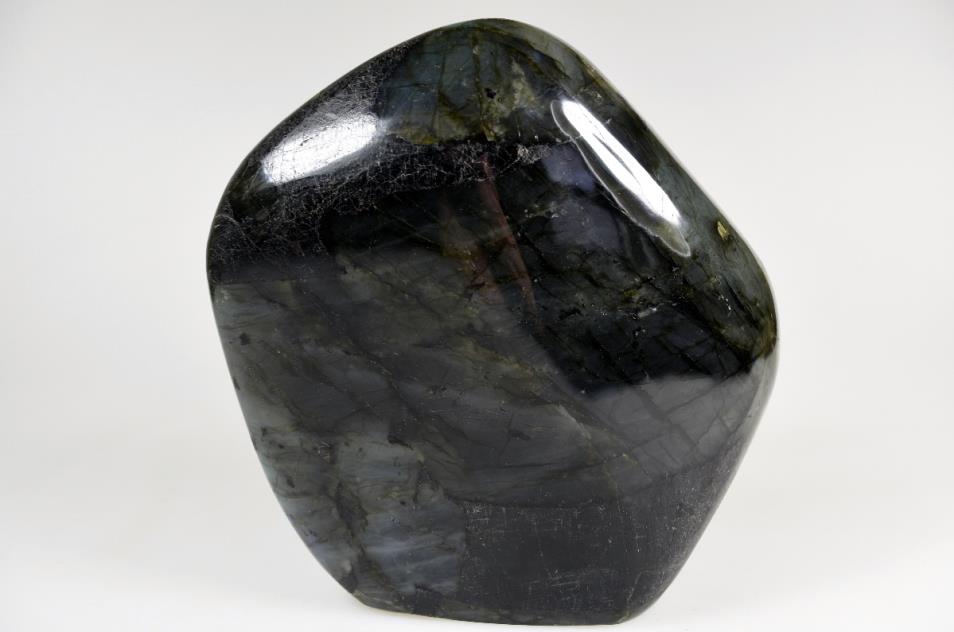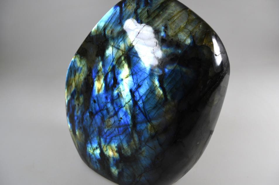 Labradorite Freeform, crystal for sale from Madagascar. This striking 14cm wide and 13.5cm tall Labradorite Freeform displays a rich mix of gold and blue colours flashing from deep within the stone. The Labradorite is of the highest grade and has been sympathetically hand cut and polished to produce an impressive individual look. Excellent Labradorescence is shown also known as the schiller effect which is the stones famous property. When exposed to the light the gem becomes a shimmering tapestry of colour. Hand selected by ourselves in Madagascar this freeform is of the highest grade and its striking beauty will enchant you.The natives of Pauls island off the coast of Labrador have told the story of Labradorite for generations. The tale recounts a legendary Inuit warrior the first to discover that the Aurora Borealis had been stolen from the skyand imprisoned in the gem known as Labradorite, smashing the stone with his spear he returned the northern lights to their home, but some light remained eternally encased in the crystal. As legend has it this is how the phenomenon of Labradoresence came to be.