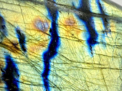 Labradorite is a mineral of the plagioclase feldspar group, and this beautiful crystal consists of both albite and anorthite.