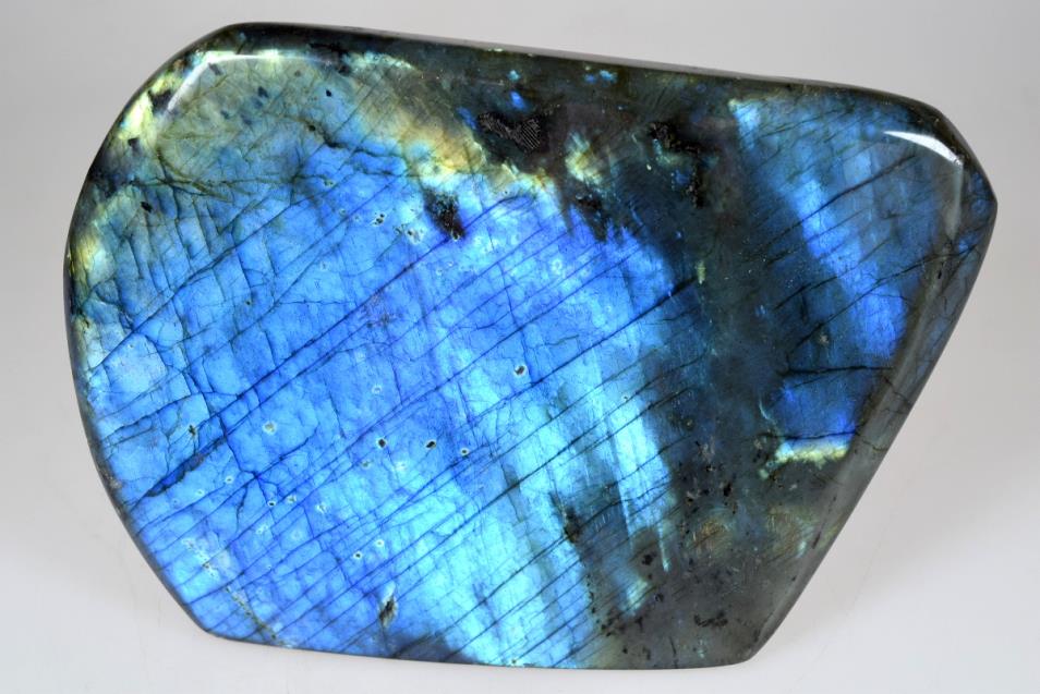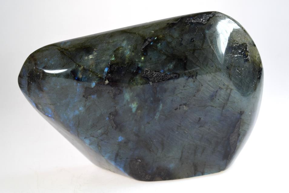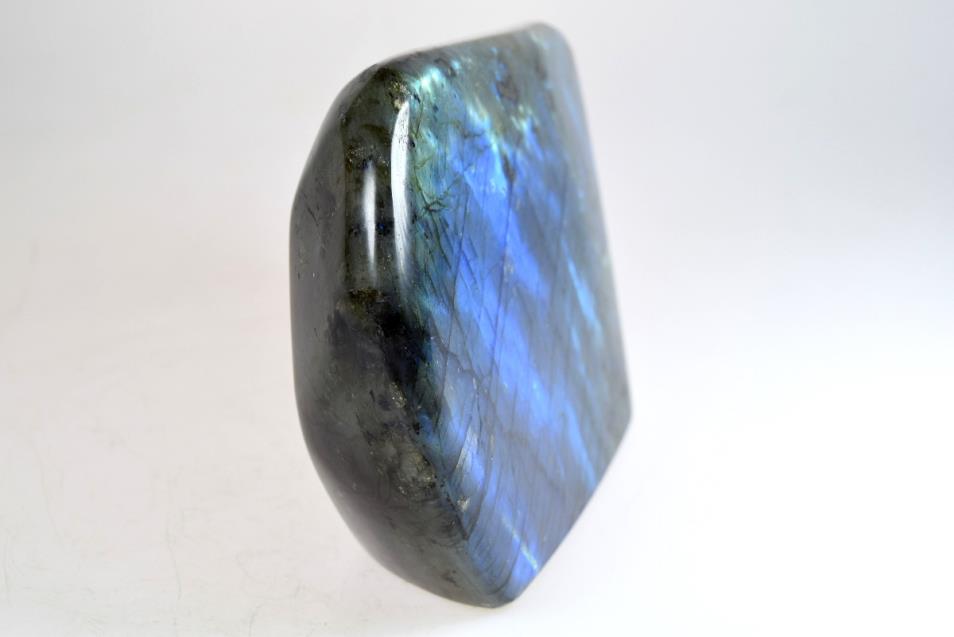 Labradorite Freeform, crystal from Madagascar. This striking 15cm wide and 10.5cm tall Labradorite Freeform displays a intense blue colour flashing from deep within the stone. The Labradorite is of the highest grade and has been sympathetically hand cut and polished to produce an impressive individual look. Excellent Labradorescence is shown also known as the schiller effect which is the stones famous property. When exposed to the light the gem becomes a shimmering tapestry of colour. Hand selected by ourselves in Madagascar this freeform is of the highest grade and its beauty will enchant you.The natives of Pauls island off the coast of Labrador have told the story of Labradorite for generations. The tale recounts a legendary Inuit warrior the first to discover that the Aurora Borealis had been stolen from the skyand imprisoned in the gem known as Labradorite, smashing the stone with his spear he returned the northern lights to their home, but some light remained eternally encased in the crystal. As legend has it this is how the phenomenon of Labradoresence came to be.