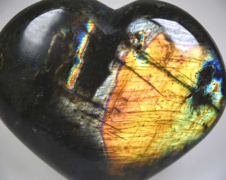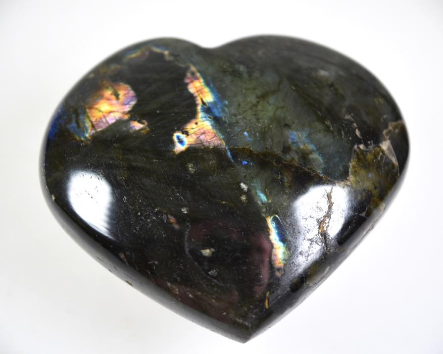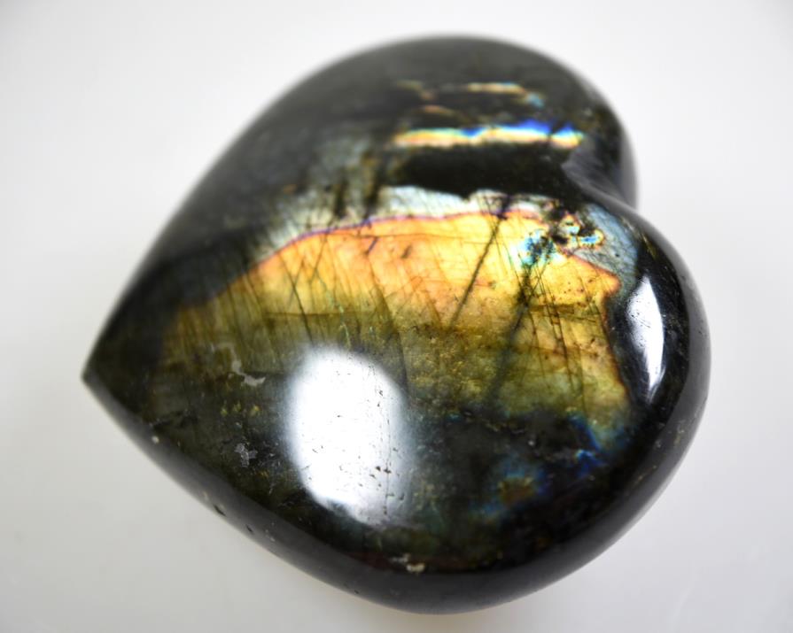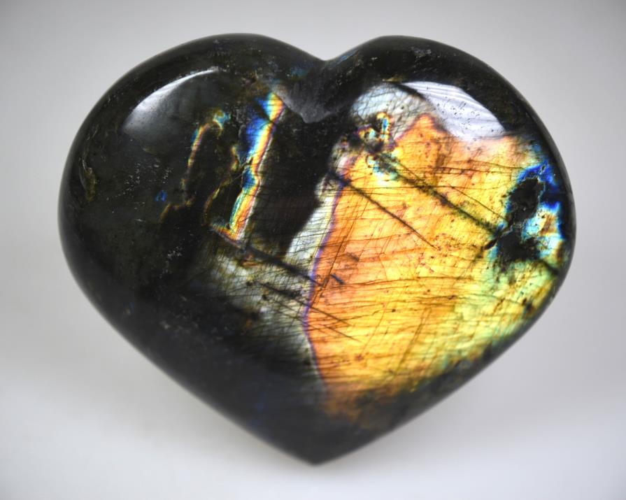 Labradorite Heart crystal for sale from Madagascar. This fabulous gold, blue and silver hand made heart is 8.6cm wide and made from very high grade Labradorite which displays a unique mix of fantastic colours. Excellent Labradorescence is shown also known as the schiller effect which is the stones famous property. When exposed to the light the gem becomes a shimmering tapestry of colour. Hand selected by ourselves in Madagascar this hearts beauty will enchant you.The natives of Pauls island off the coast of Labrador have told the story of Labradorite for generations. The tale recounts a legendary Inuit warrior the first to discover that the Aurora Borealis had been stolen from the sky and imprisoned in the gem known as Labradorite, smashing the stone with his spear he returned the northern lights to their home, but some light remained eternally encased in the crystal. As legend has it this is how the phenomenon of Labradoresence came to be.