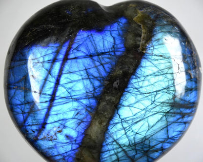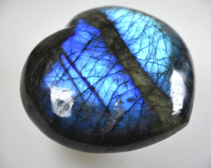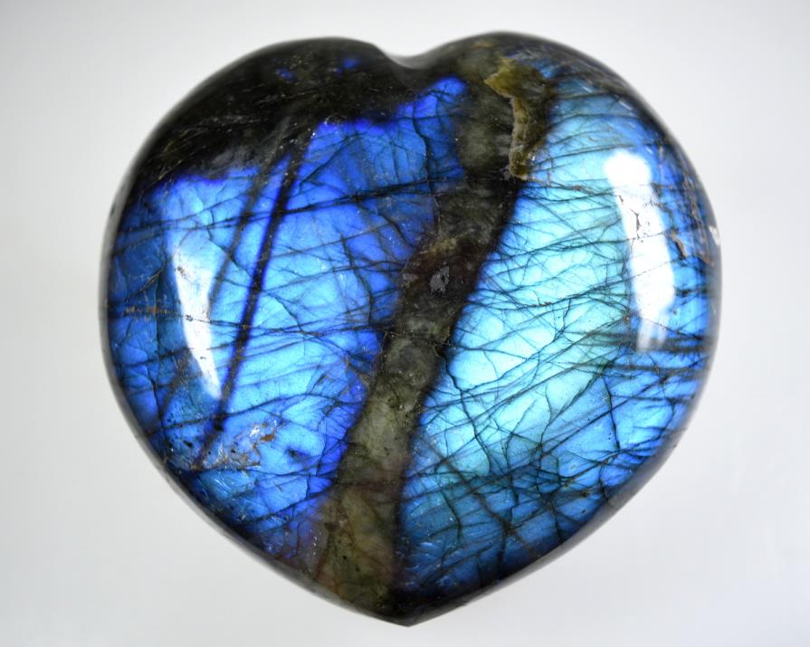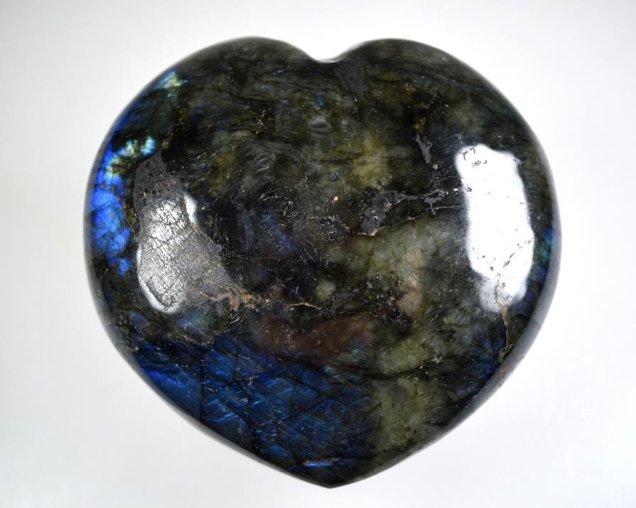 Labradorite Heart from Madagascar. This glorious hand made heart is 8.9cm wide and made from very high grade Labradorite which displays a unique mix of fantastic colours. Excellent Labradorescence is shown also known as the schiller effect which is the stones famous property. When exposed to the light the gem becomes a shimmering tapestry of colour. Hand selected by ourselves in Madagascar this hearts beauty will enchant you.The natives of Pauls island off the coast of Labrador have told the story of Labradorite for generations. The tale recounts a legendary Inuit warrior the first to discover that the Aurora Borealis had been stolen from the skyand imprisoned in the gem known as Labradorite, smashing the stone with his spear he returned the northern lights to their home, but some light remained eternally encased in the crystal. As legend has it this is how the phenomenon of Labradoresence came to be.