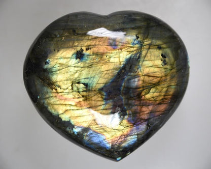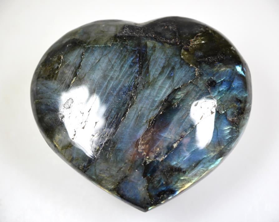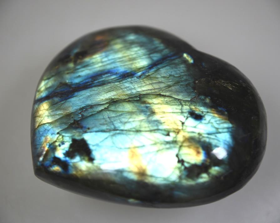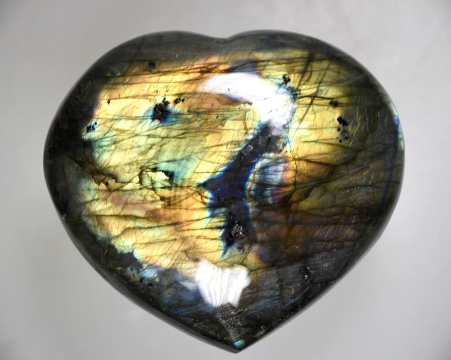 Labradorite Heart crystal for sale from Madagascar. This fabulous gold, blue and green hand made heart is 9.7cm wide and made from very high grade Labradorite which displays a unique mix of fantastic colours. Excellent Labradorescence is shown also known as the schiller effect which is the stones famous property. When exposed to the light the gem becomes a shimmering tapestry of colour. Hand selected by ourselves in Madagascar this hearts beauty will enchant you.The natives of Pauls island off the coast of Labrador have told the story of Labradorite for generations. The tale recounts a legendary Inuit warrior the first to discover that the Aurora Borealis had been stolen from the sky and imprisoned in the gem known as Labradorite, smashing the stone with his spear he returned the northern lights to their home, but some light remained eternally encased in the crystal. As legend has it this is how the phenomenon of Labradoresence came to be.