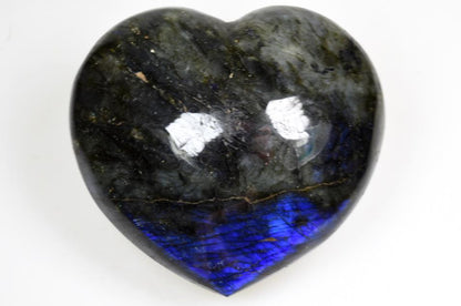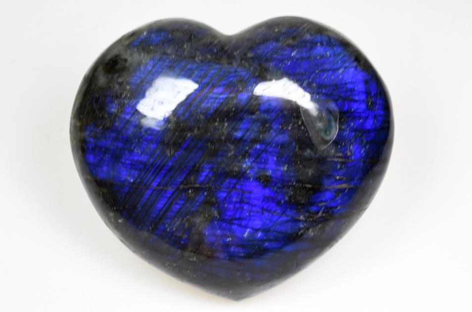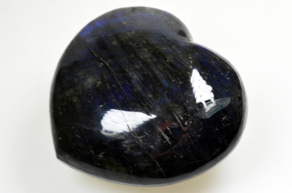 Labradorite Heart from Madagascar. This incredible large hand made heart is 11.2cm wide and made from very high grade Labradorite which displays beautiful colours. Excellent Labradorescence is shown also known as the schiller effect which is the stones famous property. When exposed to the light the gem becomes a shimmering tapestry of colour. Hand selected by ourselves in Madagascar this hearts beauty will enchant you.The natives of Pauls island off the coast of Labrador have told the story of Labradorite for generations. The tale recounts a legendary Inuit warrior the first to discover that the Aurora Borealis had been stolen from the skyand imprisoned in the gem known as Labradorite, smashing the stone with his spear he returned the northern lights to their home, but some light remained eternally encased in the crystal. As legend has it this is how the phenomenon of Labradoresence came to be.