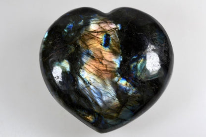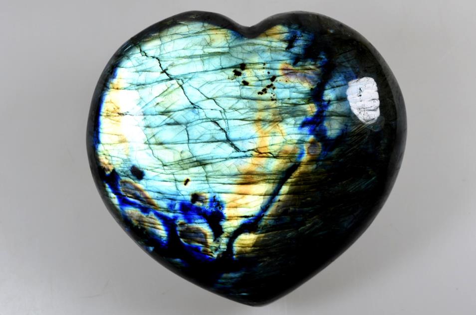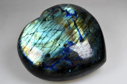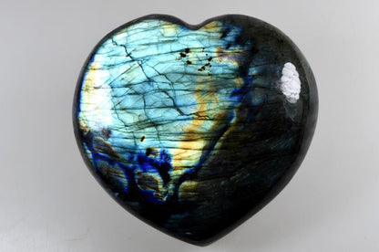 Labradorite Heart crystal for sale from Madagascar. This gorgeous gold and blue hand made heart is 12.2cm wide and made from very high grade Labradorite which displays a unique mix of fantastic colours. Excellent Labradorescence is shown also known as the schiller effect which is the stones famous property. When exposed to the light the gem becomes a shimmering tapestry of colour. Hand selected by ourselves in Madagascar this hearts beauty will enchant you.The natives of Pauls island off the coast of Labrador have told the story of Labradorite for generations. The tale recounts a legendary Inuit warrior the first to discover that the Aurora Borealis had been stolen from the sky and imprisoned in the gem known as Labradorite, smashing the stone with his spear he returned the northern lights to their home, but some light remained eternally encased in the crystal. As legend has it this is how the phenomenon of Labradoresence came to be.