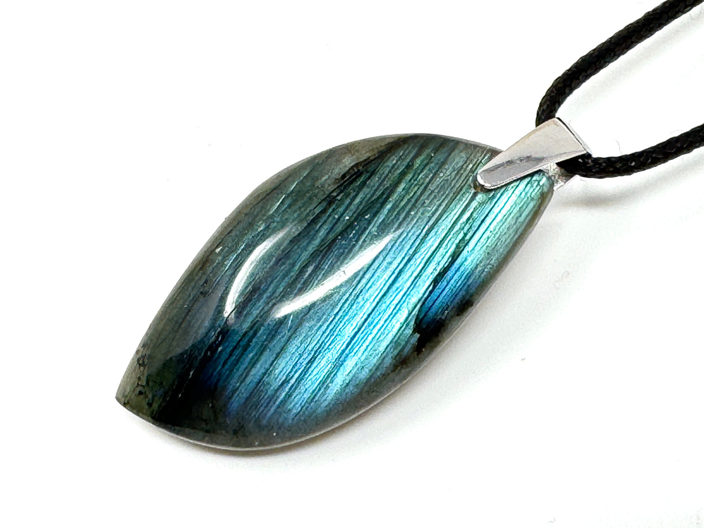 Measuring 4.4cm long, this Labradorite Pendant has been hand-made using a flashy Labradorite Gemstone and displays iridescent blue colours shining from within the stone. Upon exposure to light, the gem shimmers and shines in a glorious array of colours.