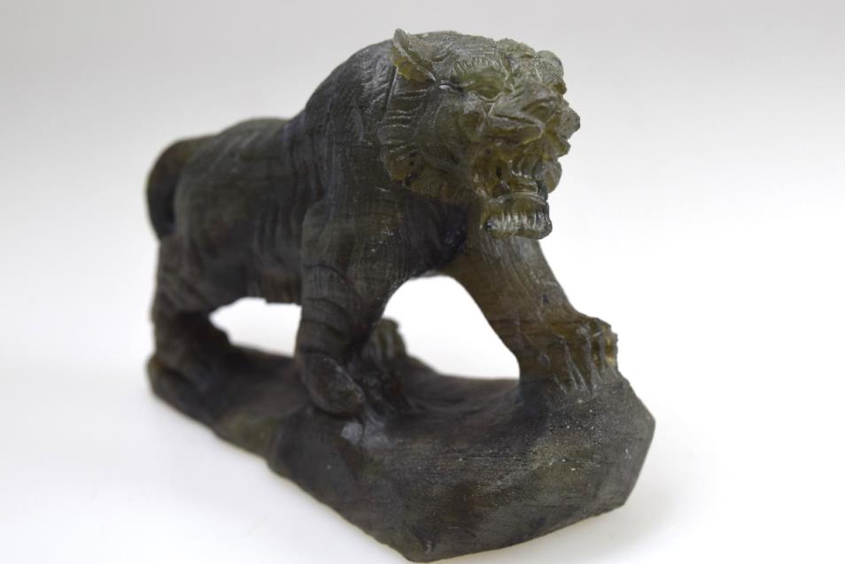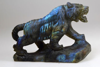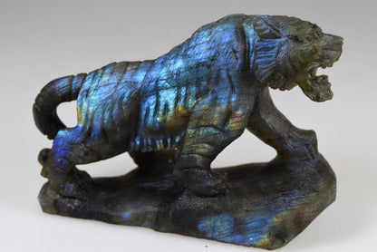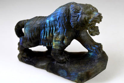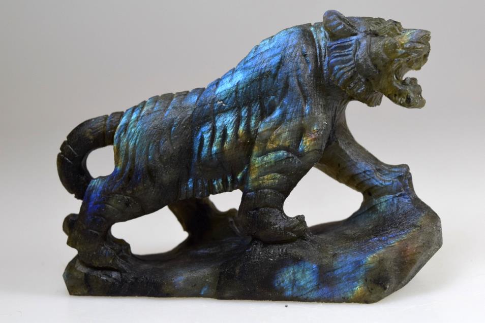 Labradorite Tiger Carving 10.4cm long, this incredible carving has been hand carved displaying an amazing mix of vibrant colours. This beautifully tactile carving is of a very high grade. Excellent Labradorescence is shown also known as the schiller effect which is the stones famous property. When exposed to the light the gem becomes a shimmering tapestry of colour. Hand selected by ourselves for it's high quality this rare carving's beauty will enchant you.The natives of Pauls island off the coast of Labrador have told the story of Labradorite for generations. The tale recounts a legendary Inuit warrior the first to discover that the Aurora Borealis had been stolen from the sky and imprisoned in the gem known as Labradorite, smashing the stone with his spear he returned the northern lights to their home, but some light remained eternally encased in the crystal. As legend has it this is how the phenomenon of Labradoresence came to be.
