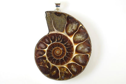 Ammonite half Pendant very large bevel set in 925 silver. This striking 5.7cm tall cut and polished Ammonite Pendant is bevel set in 925 silver it is beautifully hand crafted using the highest grade Madagascan ammonites from the cretaceous period, 120 million years old found in Mahajanga. This pendant displays its richly coloured calcite chambers.