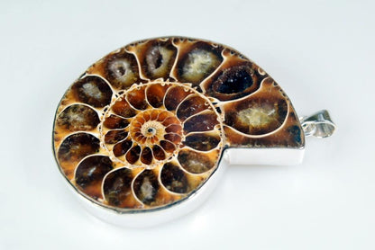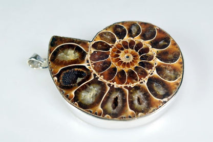 Ammonite half Pendant very large bevel set in 925 silver. This stunning 5.6cm tall cut and polished Ammonite Pendant is bevel set in 925 silver it is beautifully hand crafted using the highest grade Madagascan ammonites from the cretaceous period, 120 million years old found in Mahajanga, north west Madagascar. This pendant displays its richly coloured calcite chambers.